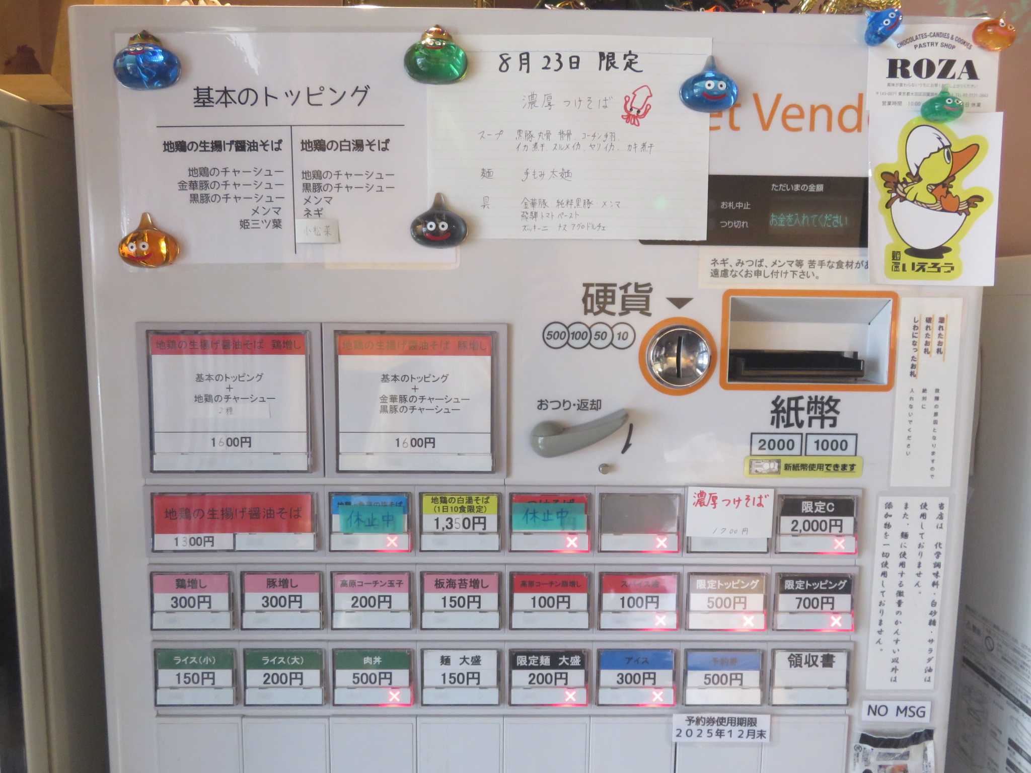 メニューは地鶏の生揚げ醤油そば、地鶏の白湯そば、濃厚つけそばのラインアップとなっており、組み合わせで鶏増し、豚増しが選べるようです。