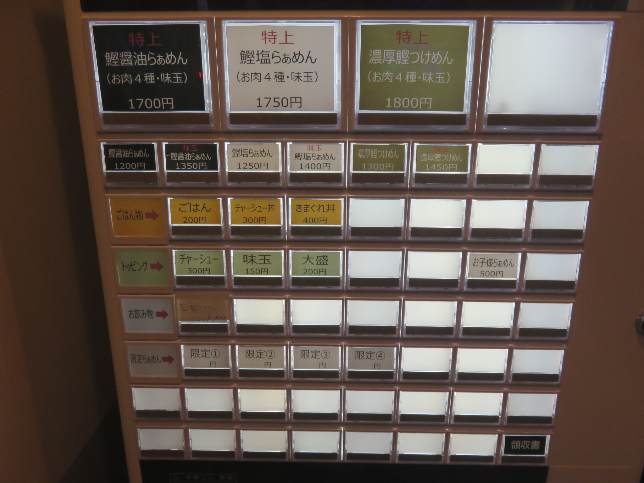 メニューは鰹醤油らぁめん、鰹塩らぁめん、濃厚鰹つけめんのラインアップとなっており、組み合わせで特上、味玉が選べるようです。