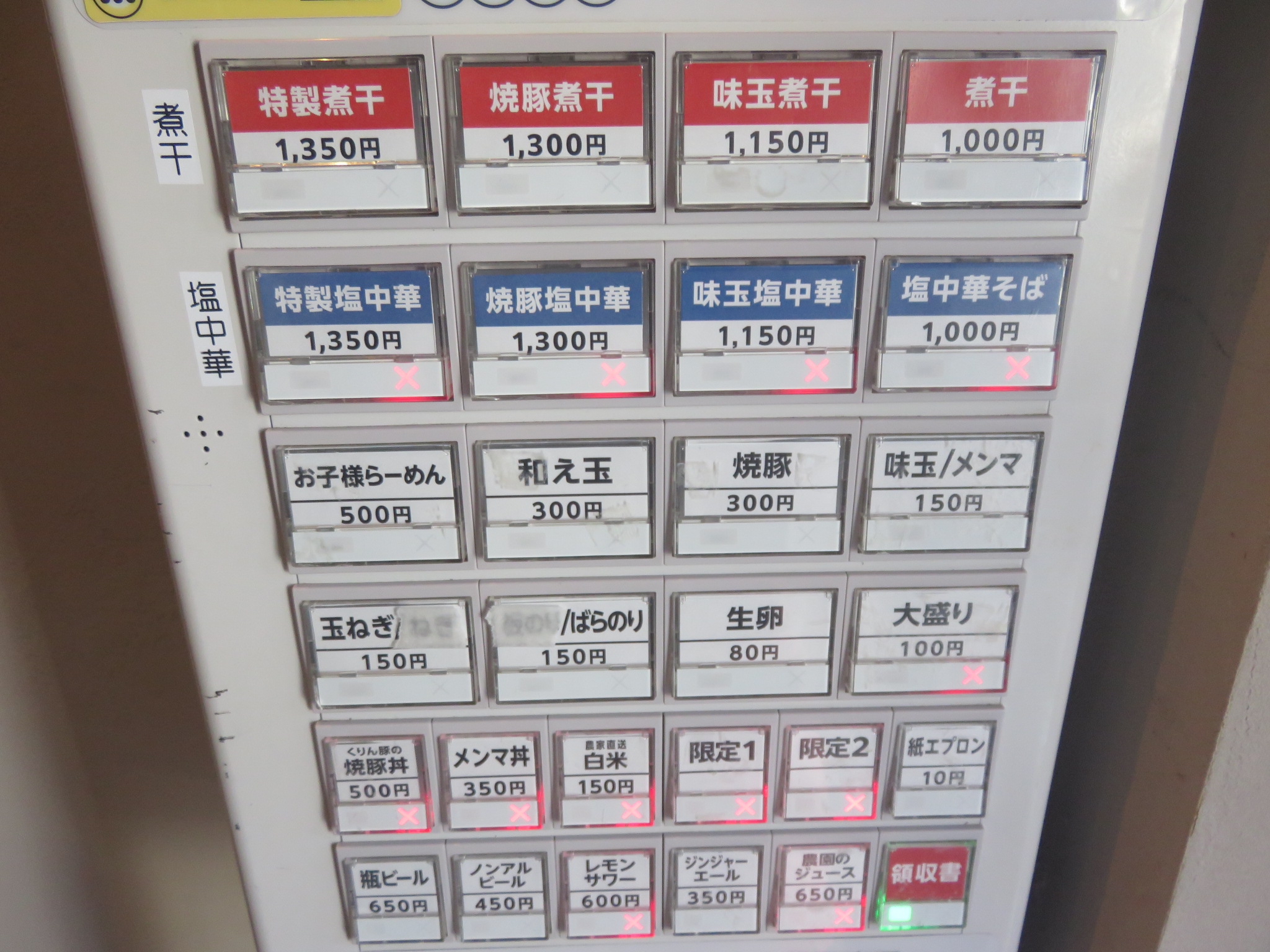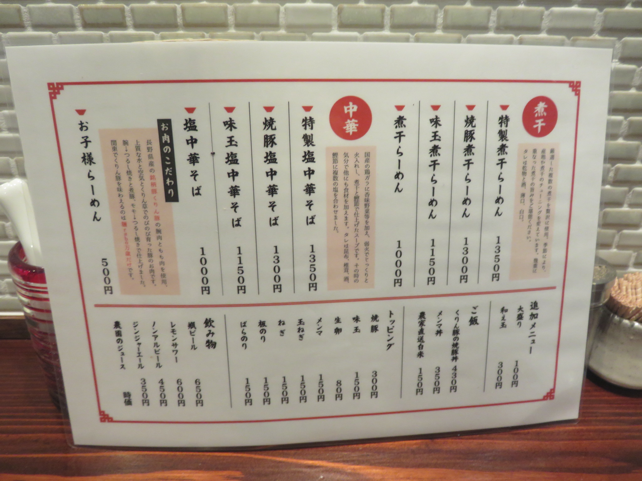 メニューは煮干、塩中華のツートップ体制となっており、組み合わせで特製、焼豚、味玉が選べるようです。