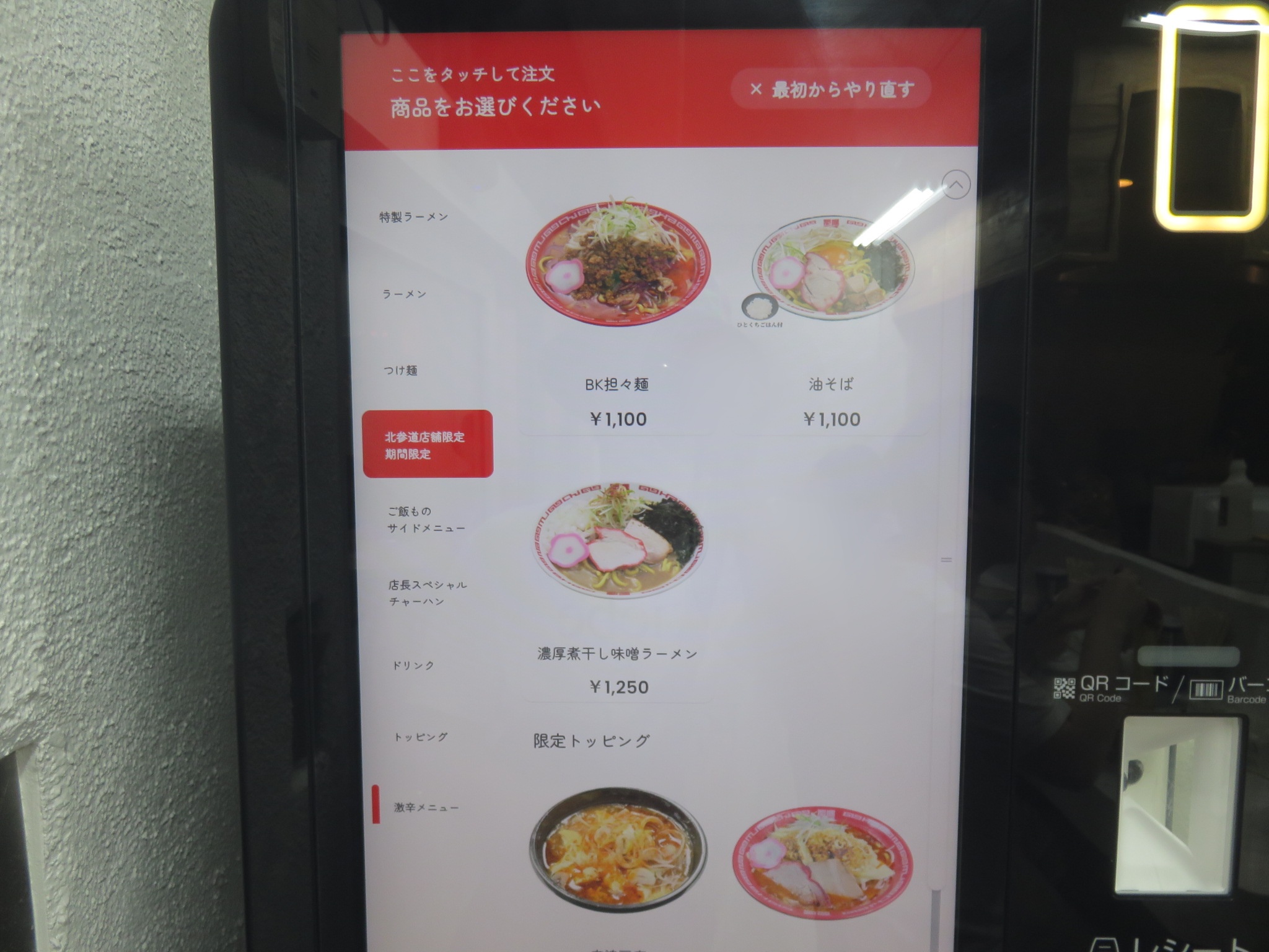 どれにするか悩ましいラインアップですが、ここは気になる濃厚煮干し味噌ラーメンをタップします。