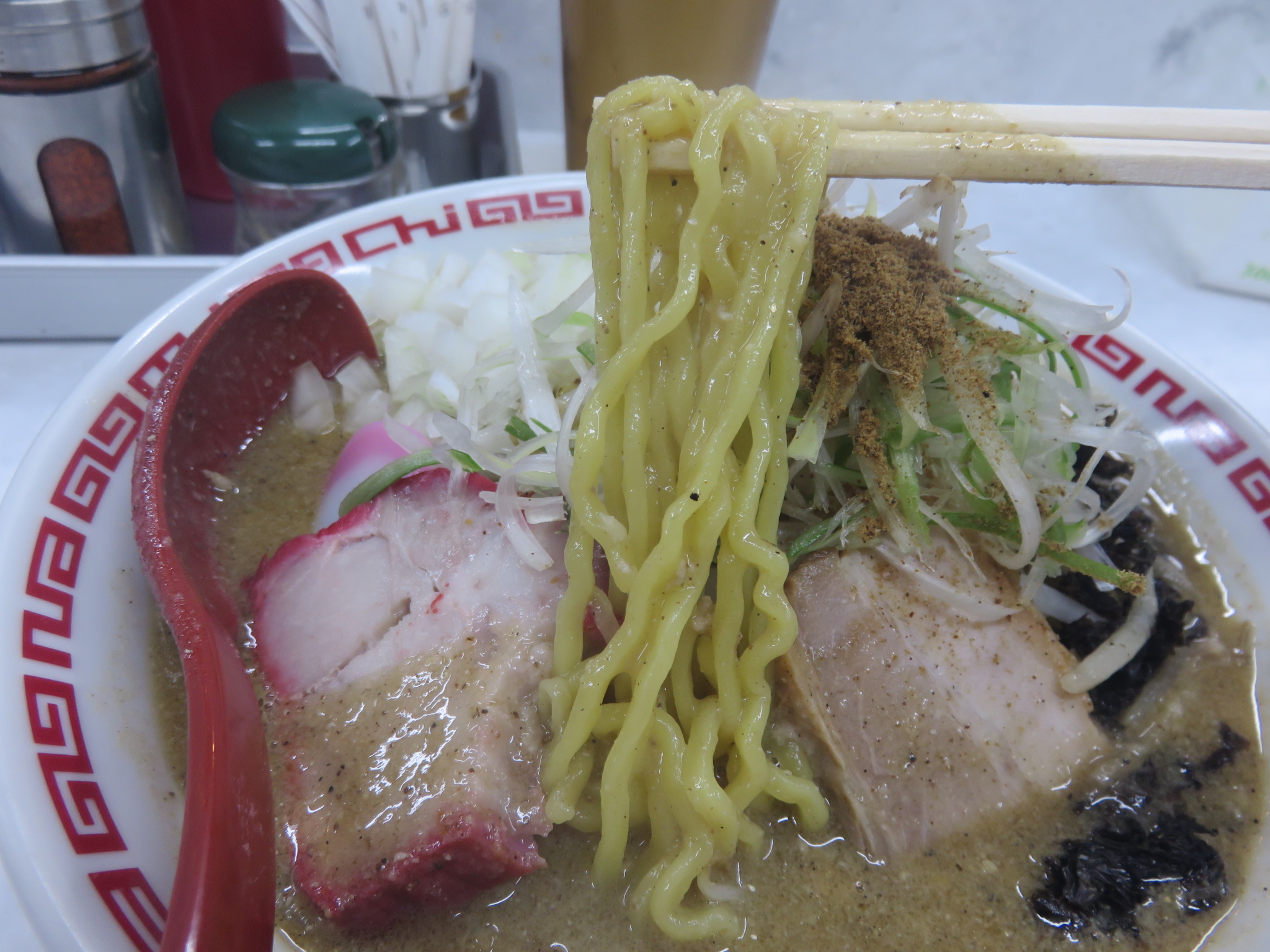 ど濃厚なスープは太麺にも合いそうですが、それを越えてこちらの麺の方が相性よく感じます。