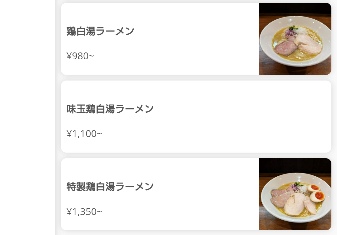 | 具 | 鶏チャーシュー、豚チャーシュー、穂先メンマ、カイワレ |