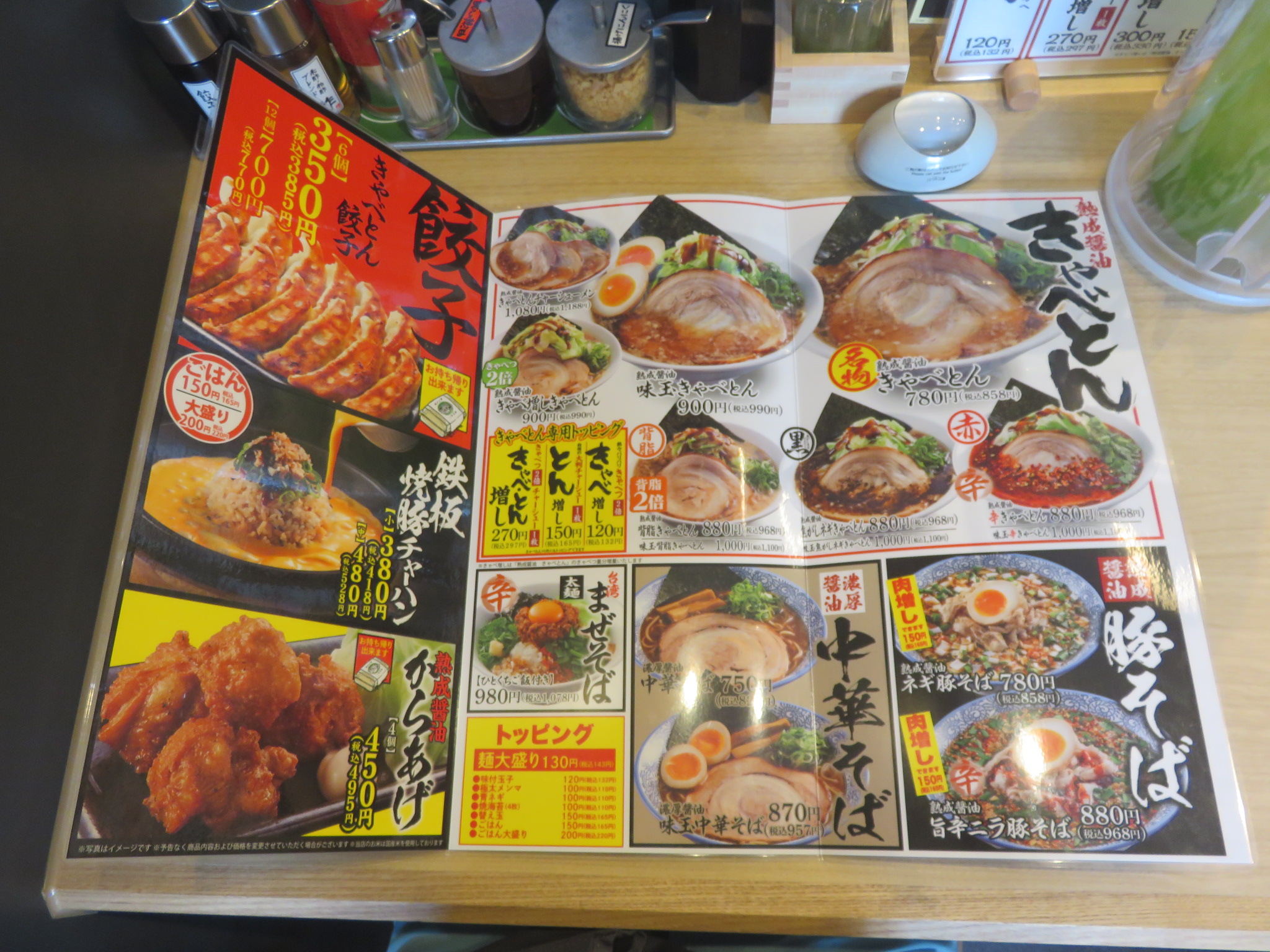 メニューはきゃべとん、赤きゃべとん、焦がしネギきゃべとん、背脂きゃべとん、きゃべとんチャーシューメン、きゃべ増しきゃべとん、ネギ豚そば、旨辛ニラ豚そば、中華そば、味玉中華そば、まぜそばのラインアップとなっており、組み合わせで味玉が選べるようです。