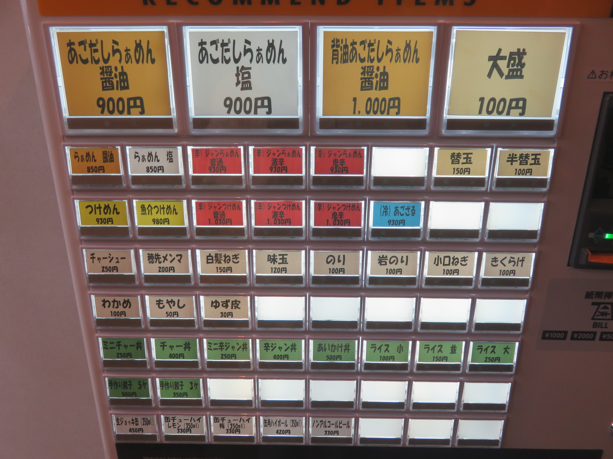 メニューはあごだしらぁめん 醤油、あごだしらぁめん 塩、背脂あごだしらぁめん 醤油、らぁめん 醤油、らぁめん 塩、ジャンらぁめん、つけめん、魚介つけめん、ジャンつけめん、あござるのラインアップとなっており、辛さが普通、激辛、鬼辛から選べるようです。