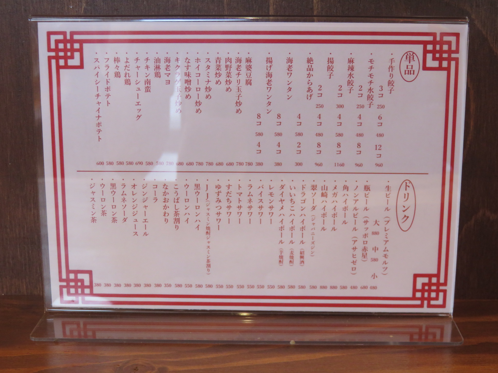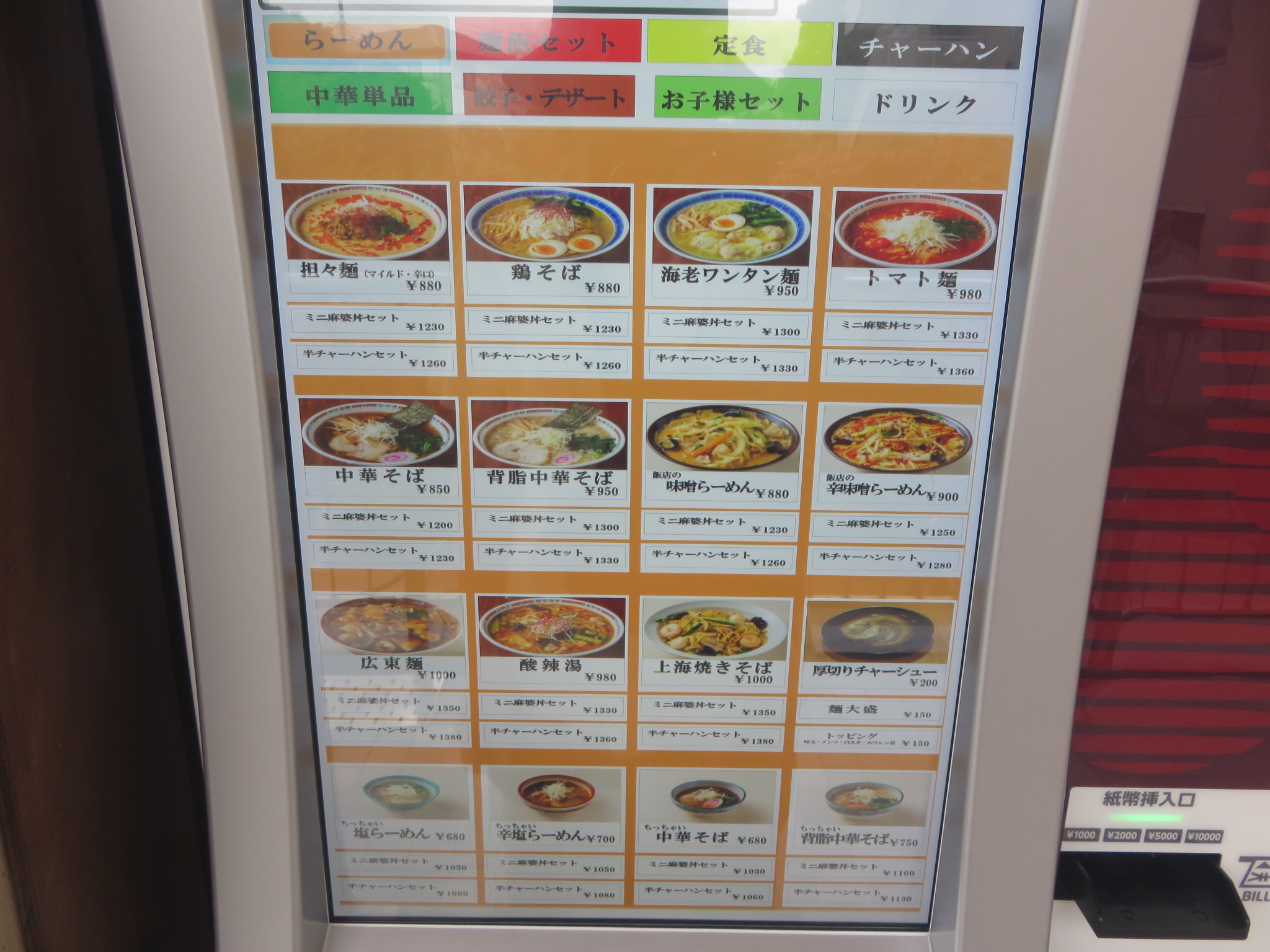 メニューは担々麺、鶏そば、海老ワンタン麺、トマト麺、中華そば、背脂中華そば、飯店の味噌らーめん、飯店の辛味噌らーめん、広東麺、酸辣湯、上海焼きそばのラインアップとなっており、辛さが辛口、マイルドから選べるようです。