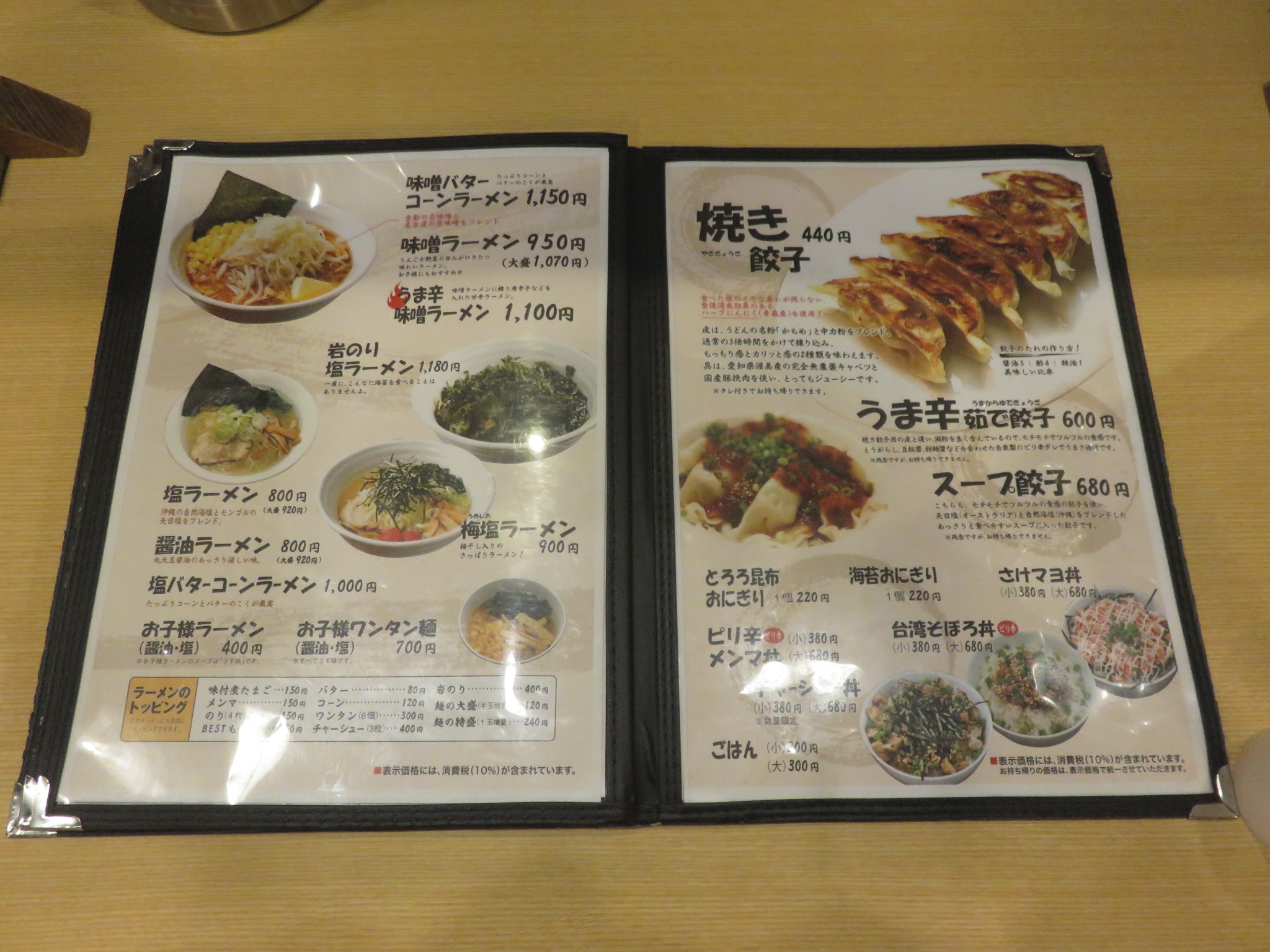 メニューは黒醤油ラーメン、黒醤油魚介ラーメン、にんにくやみつきラーメン、黒胡麻担々麺、うま辛担々麺、台湾ラーメン、うま辛台湾ラーメン、味噌コーンバターラーメン、味噌ラーメン、うま辛味噌ラーメン、岩のり塩ラーメン、塩ラーメン、醤油ラーメン、塩バターコーンラーメン、梅塩ラーメンのラインアップとなっており、麺量が大盛から選べるようです。