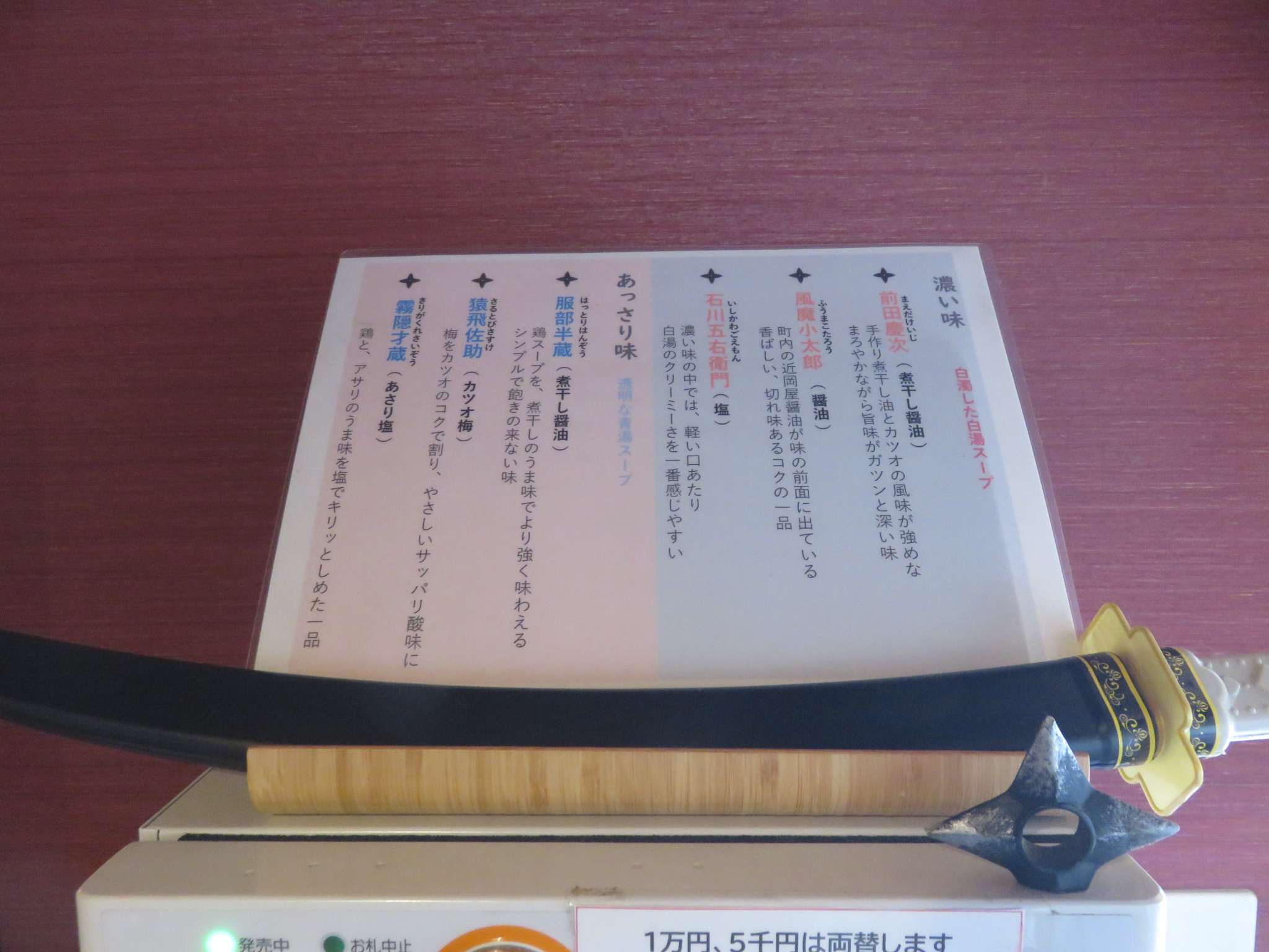 すべて歴史上の人物ですが、実際はこってり煮干し醤油、こってり醤油、こってり塩、あっさり煮干し醤油、あっさり醤油、あっさり塩という構成のようです。