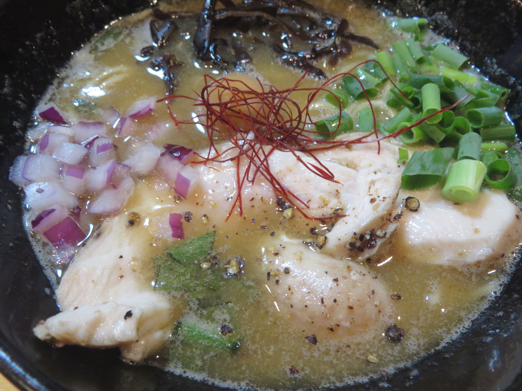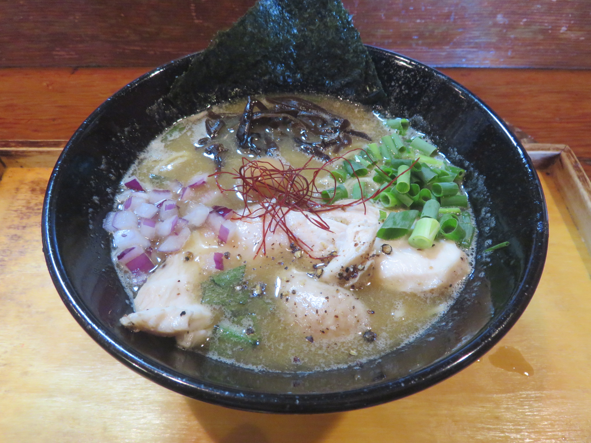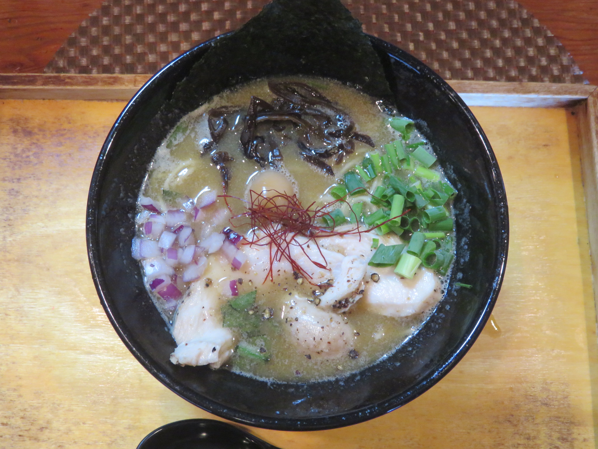 | 具 | 鶏チャーシュー、味付うずら卵、キクラゲ、刻み紫タマネギ、刻み青ネギ、海苔、糸唐辛子 |
