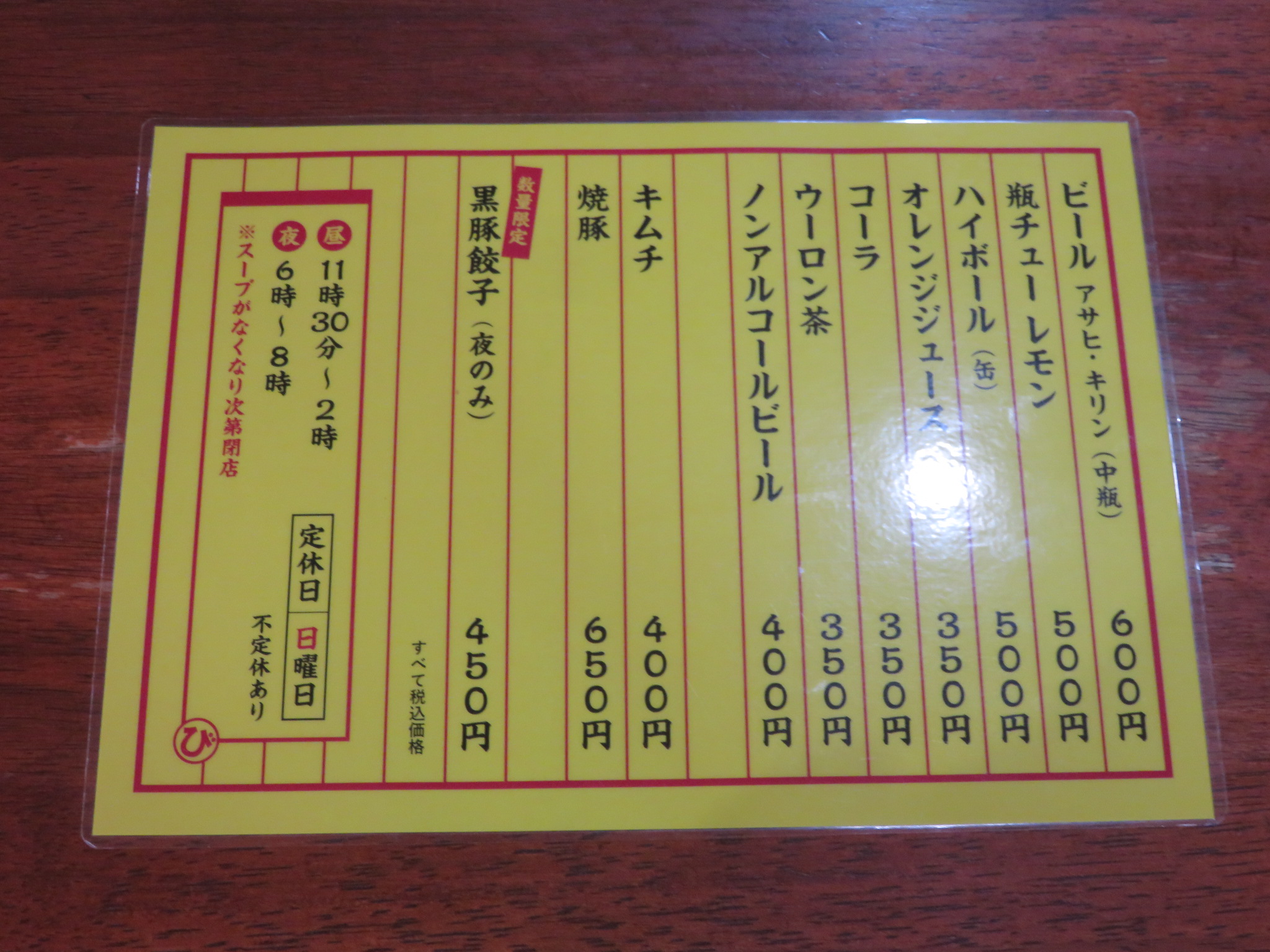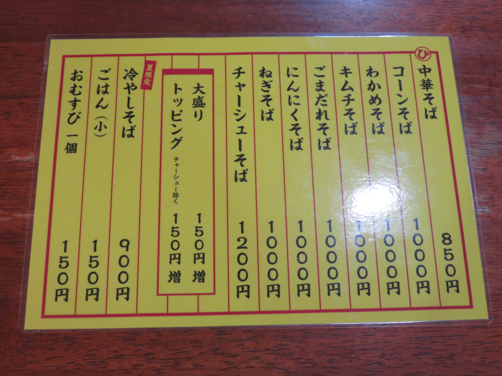 メニューは中華そば、コーンそば、わかめそば、キムチそば、ごまだれそば、にんにくそば、ねぎそば、チャーシューそば、冷やしそばのラインアップとなっています。