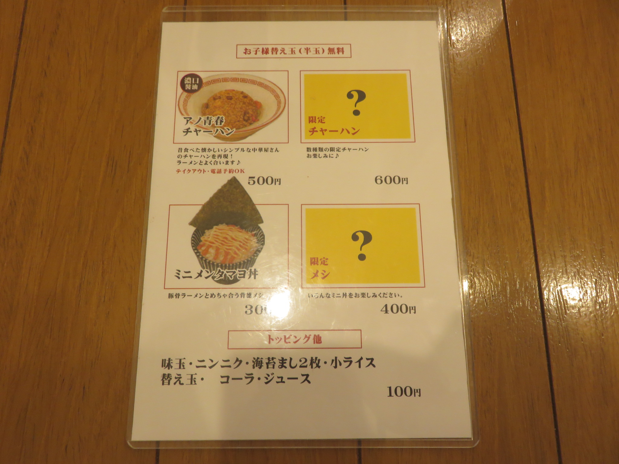 | 具 | 豚チャーシュー、刻みネギ、海苔、胡麻、一味唐辛子、背脂 |
