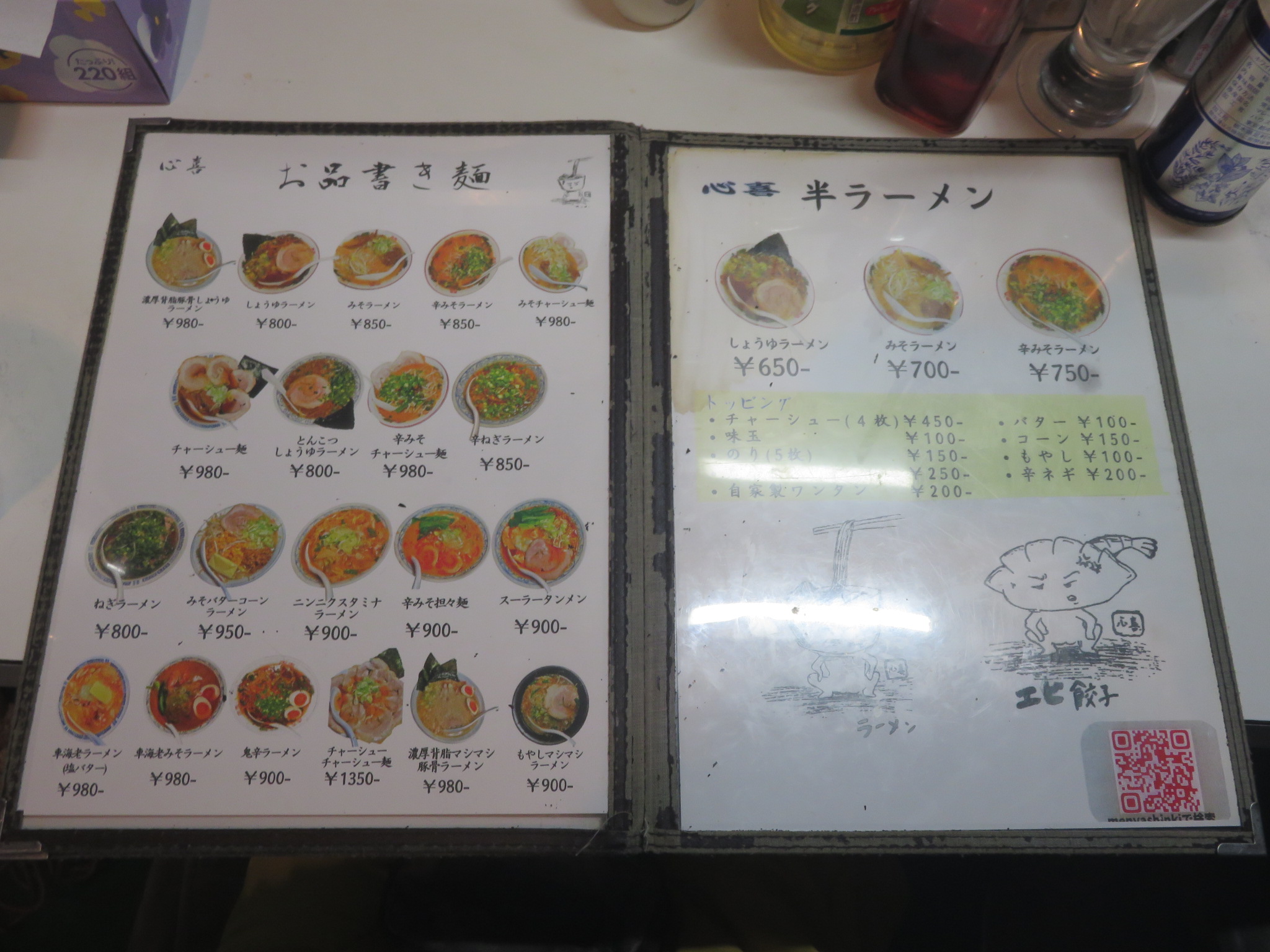 メニューは濃厚背脂豚骨醤油ラーメン、しょうゆラーメン、みそラーメン、辛みそラーメン、みそチャーシュー麺、チャーシュー麺、とんこつしょうゆラーメン、辛ねぎラーメン、ねぎラーメン、みそバターコーンラーメン、ニンニクスタミナラーメン、辛みそ担々麺、スーラータンメン、車海老ラーメン、車海老みそラーメン、鬼辛ラーメン、チャーシューチャーシュー麺、濃厚背脂マシマシ豚骨ラーメン、もやしマシマシラーメンのラインアップとなっており、麺量が半ラーメンから選べるようです。