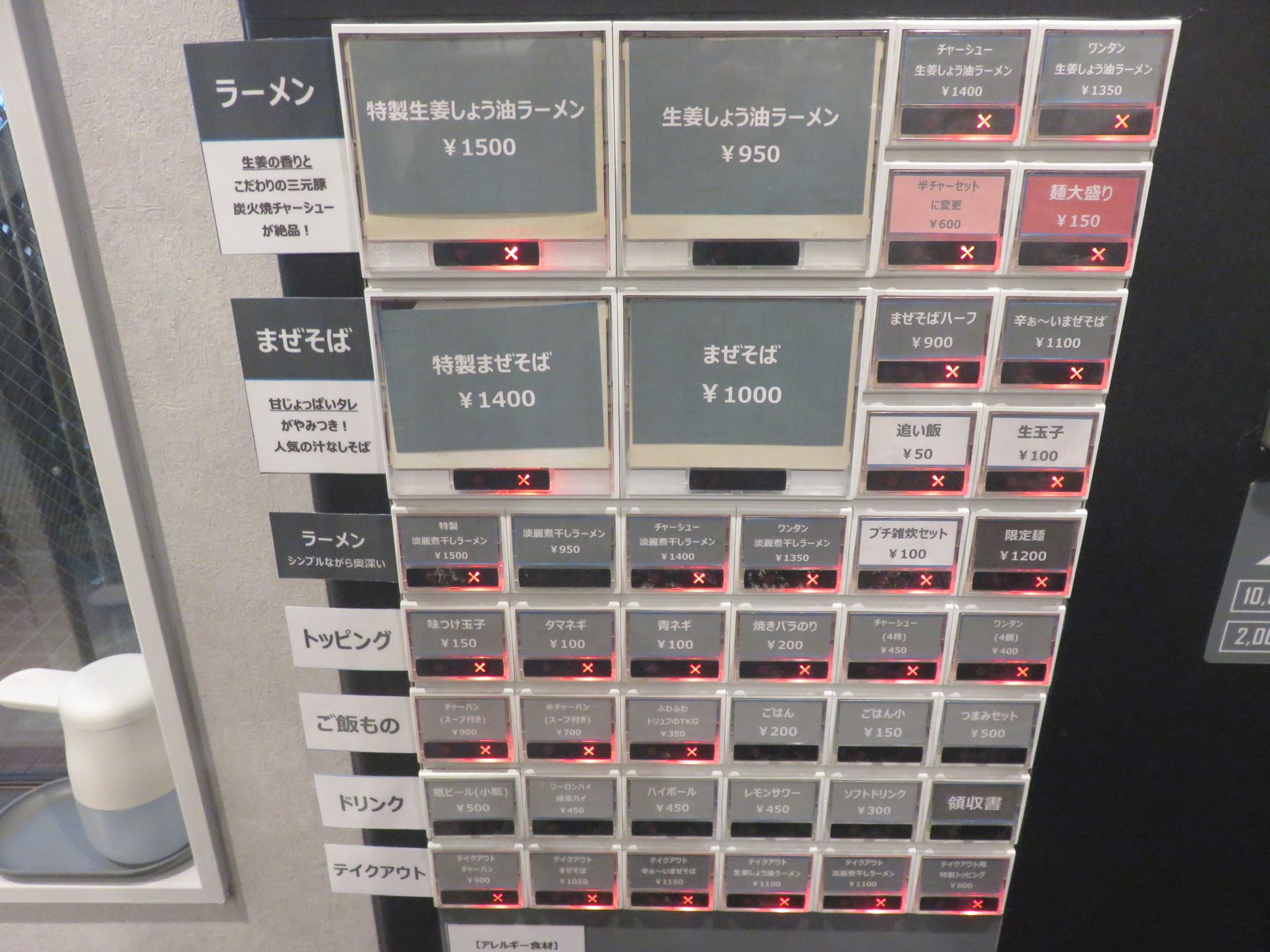 メニューは生姜しょう油ラーメン、まぜそば、辛~いまぜそば、淡麗煮干しラーメンのラインアップとなっており、組み合わせで特製、チャーシュー、ワンタンが、麺量がハーフから選べるようです。
