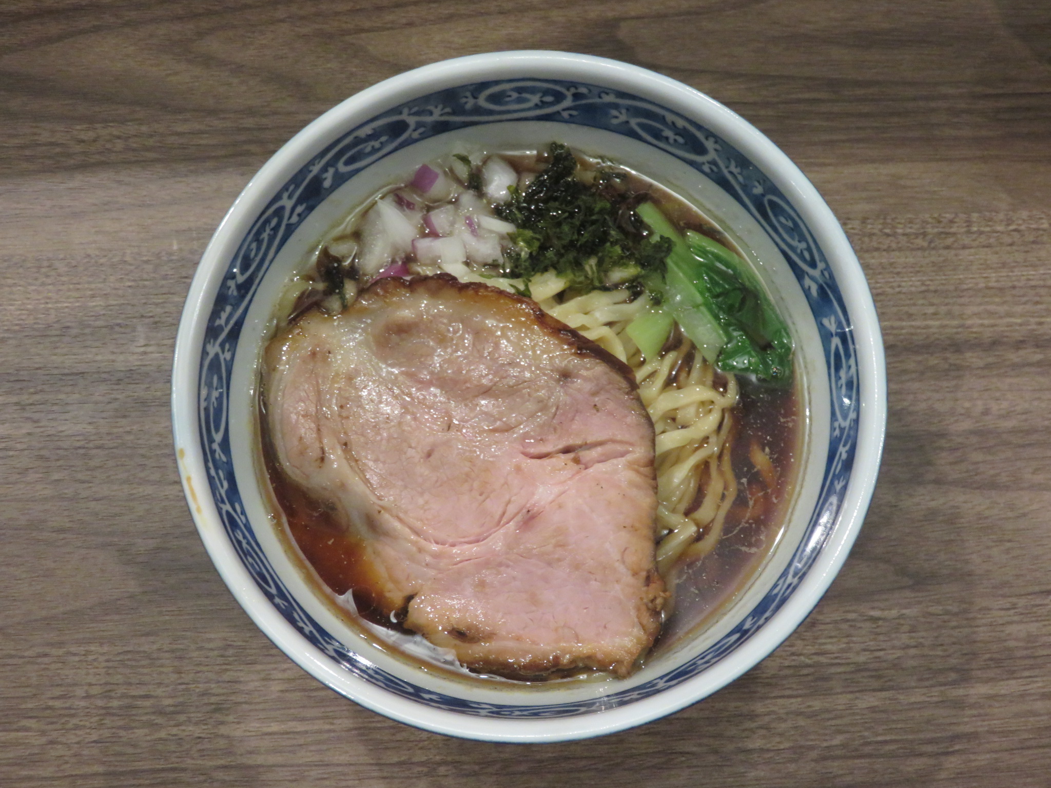 豚チャーシュー、青菜、刻み紫タマネギ、焼きばら海苔