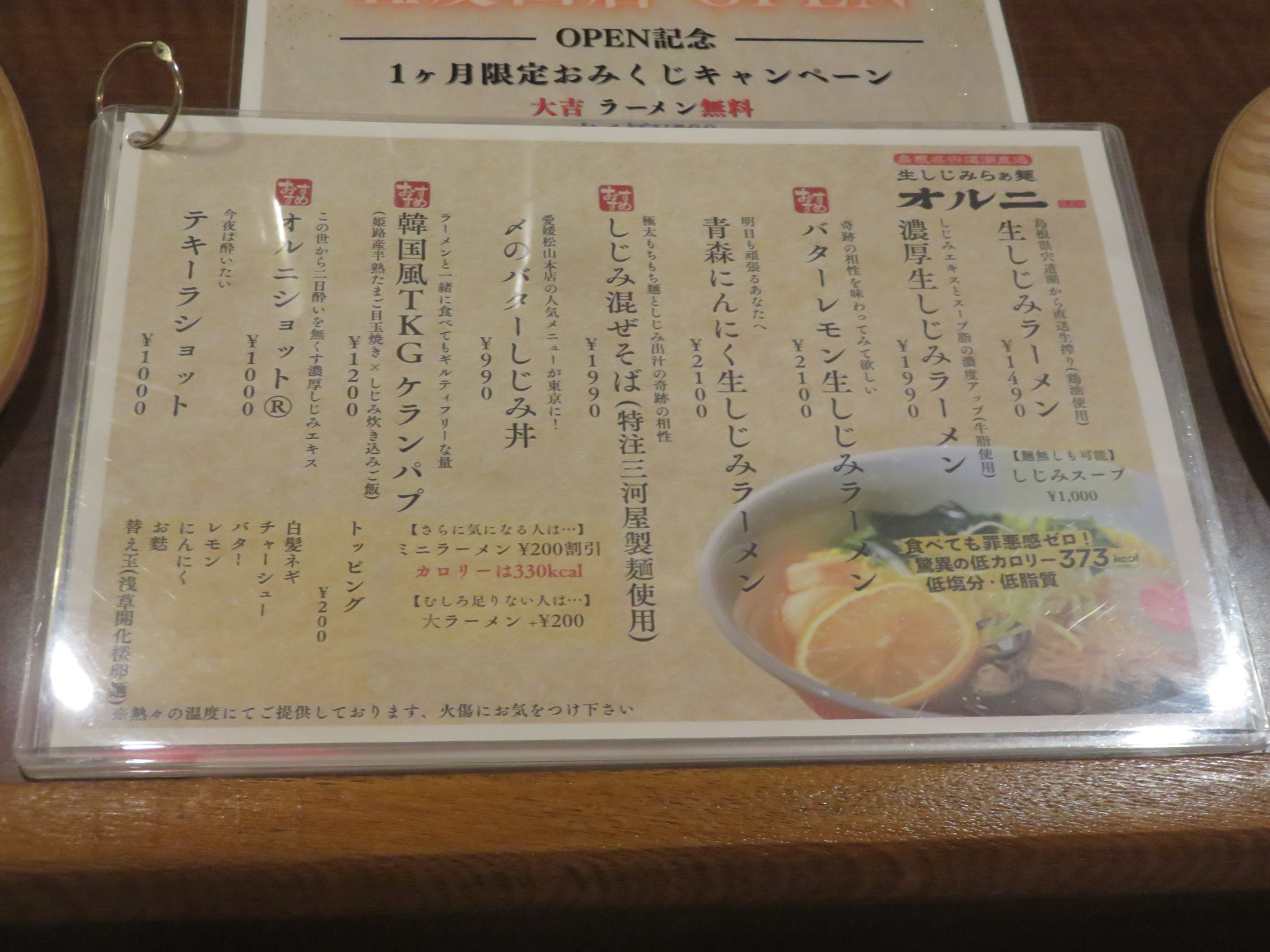 メニューは生しじみラーメン、濃厚生しじみラーメン、バターレモン生しじみラーメン、青森にんにく生しじみラーメン、しじみ混ぜそばのラインアップとなっています。
