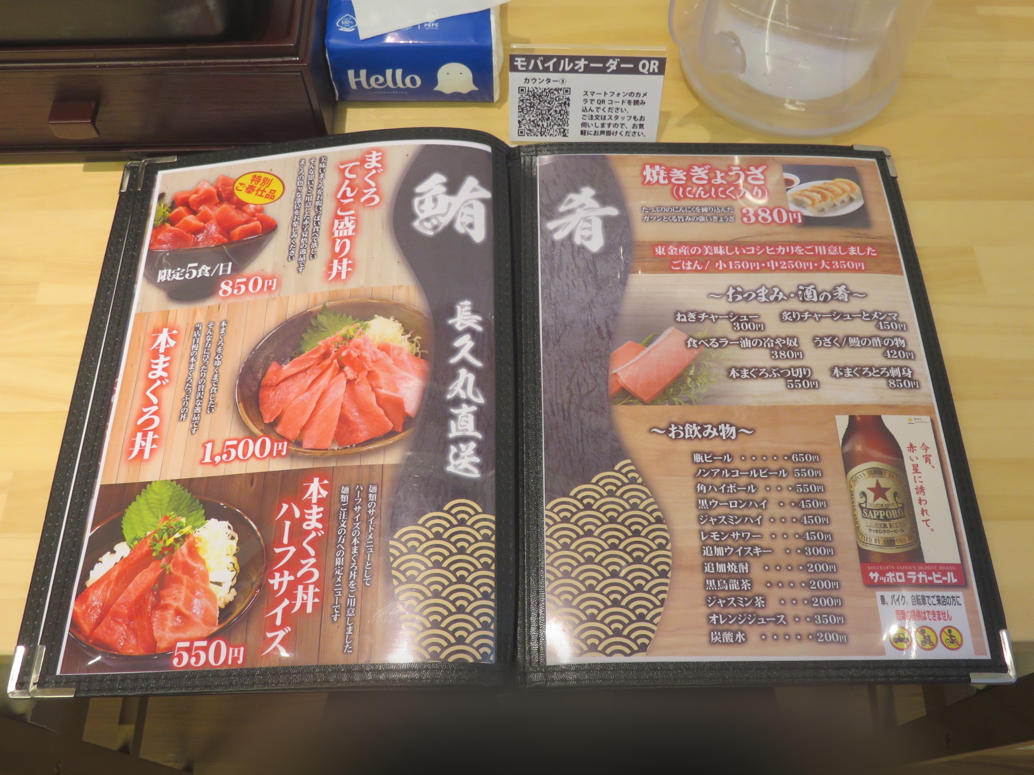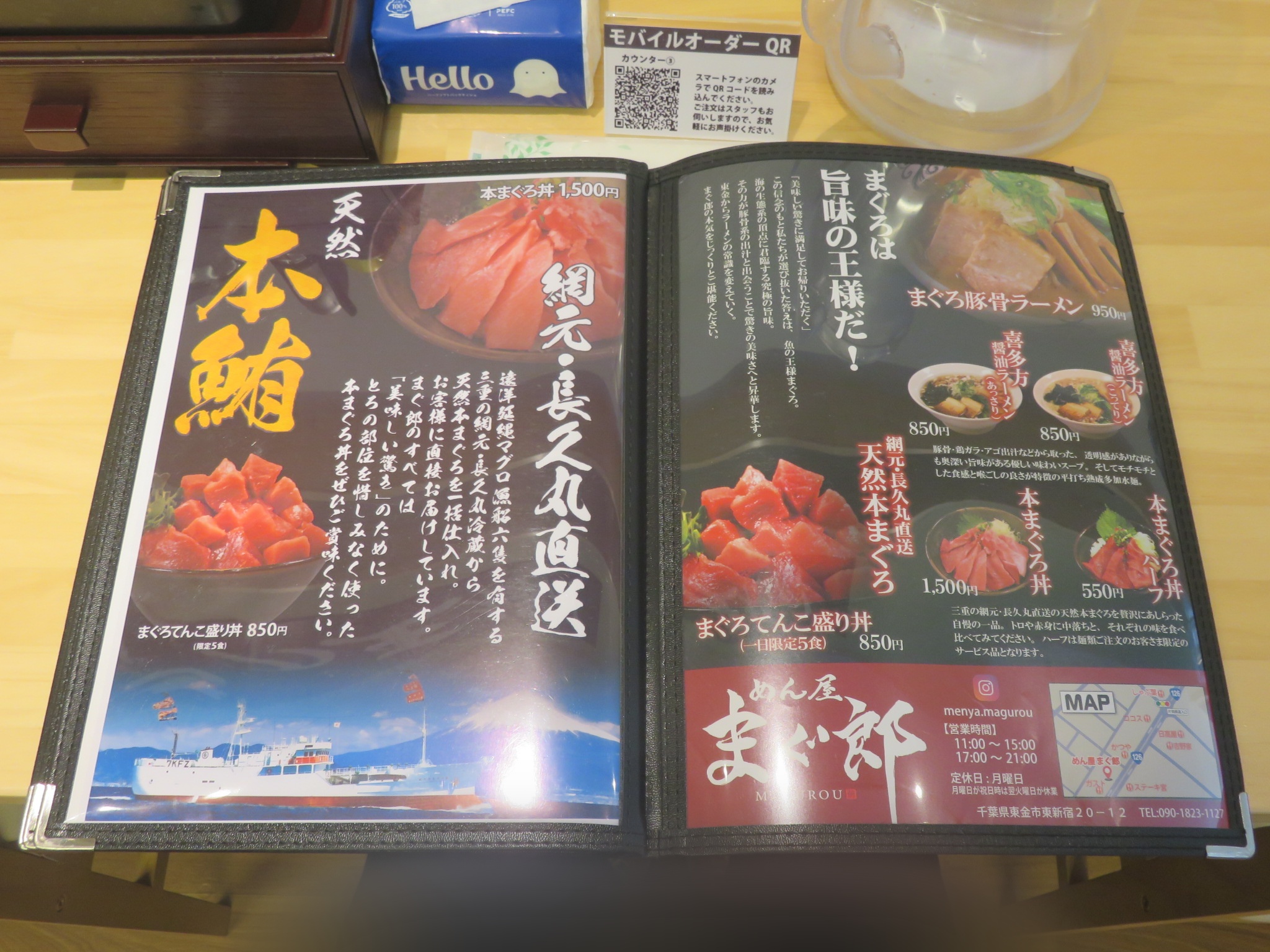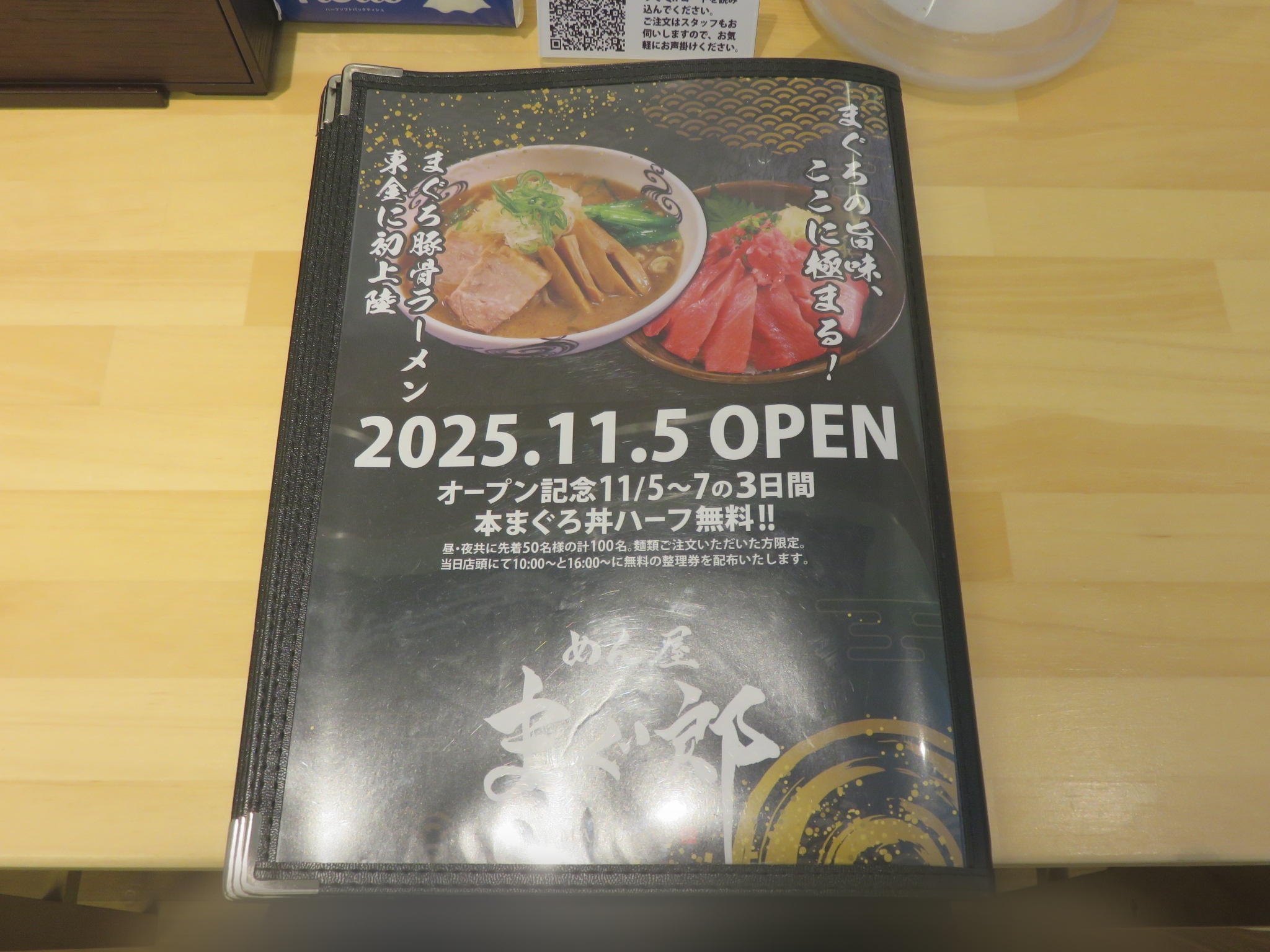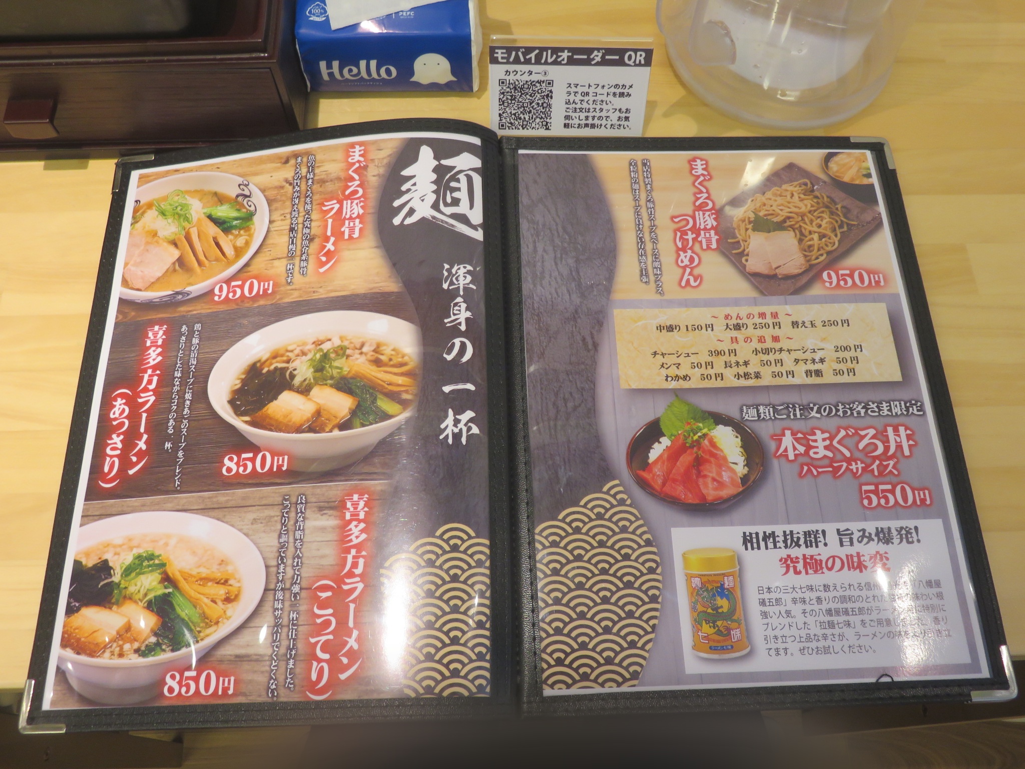 メニューはまぐろ豚骨ラーメン、喜多方ラーメン(あっさり)、喜多方ラーメン(こってり)、まぐろ豚骨つけめんのラインアップとなっています。