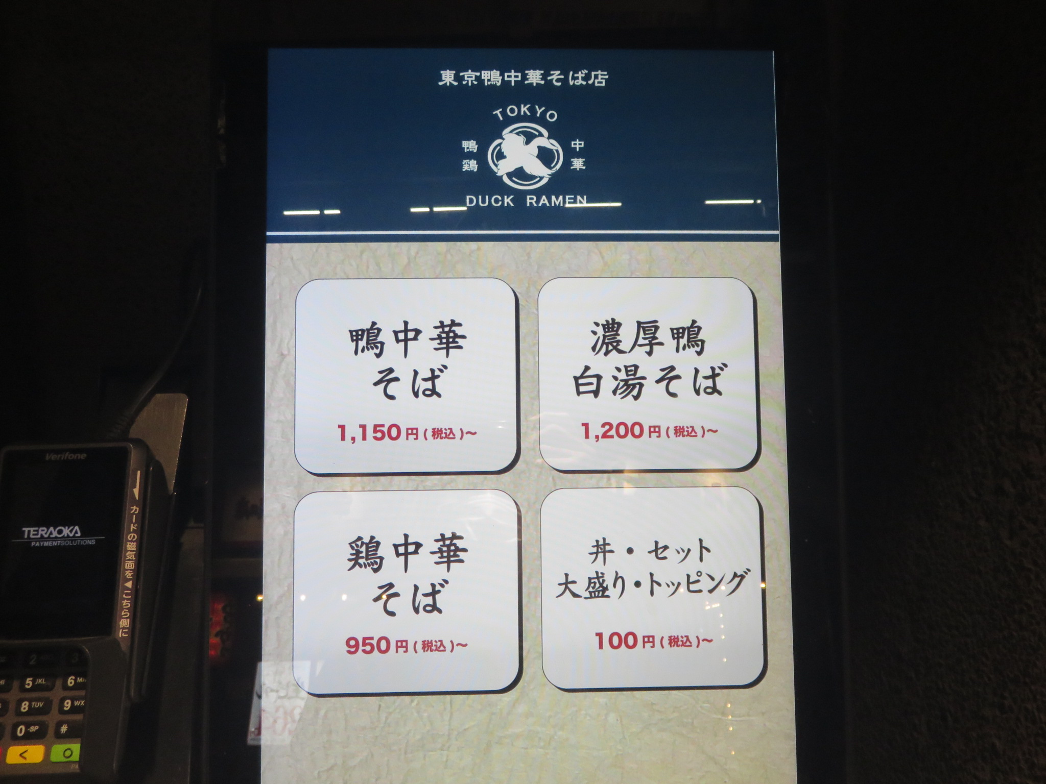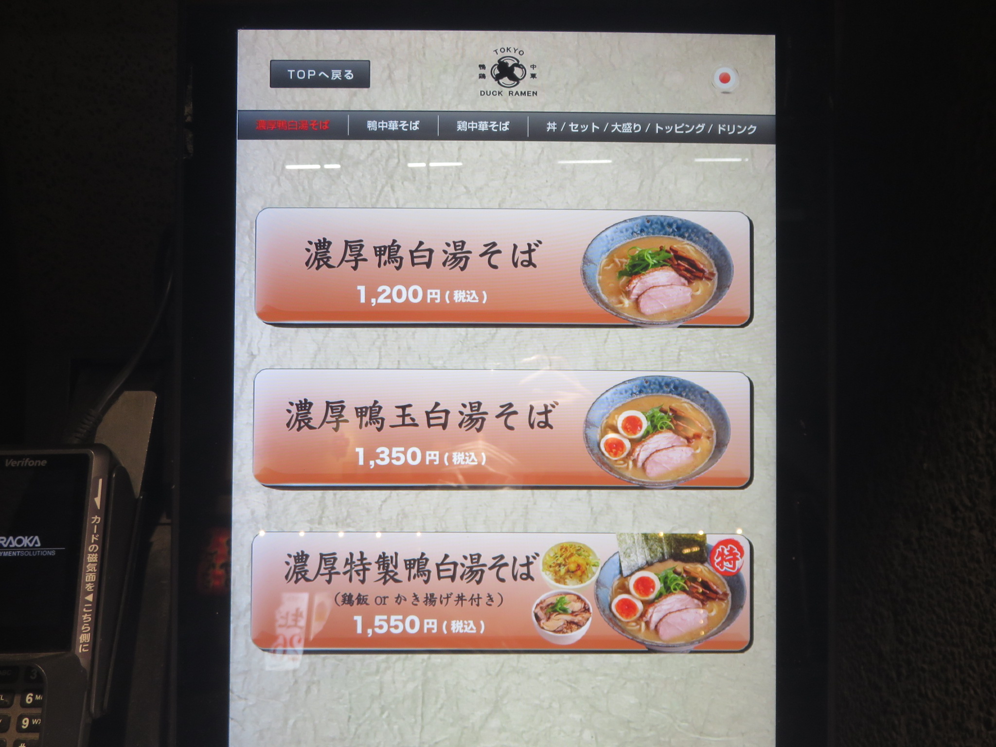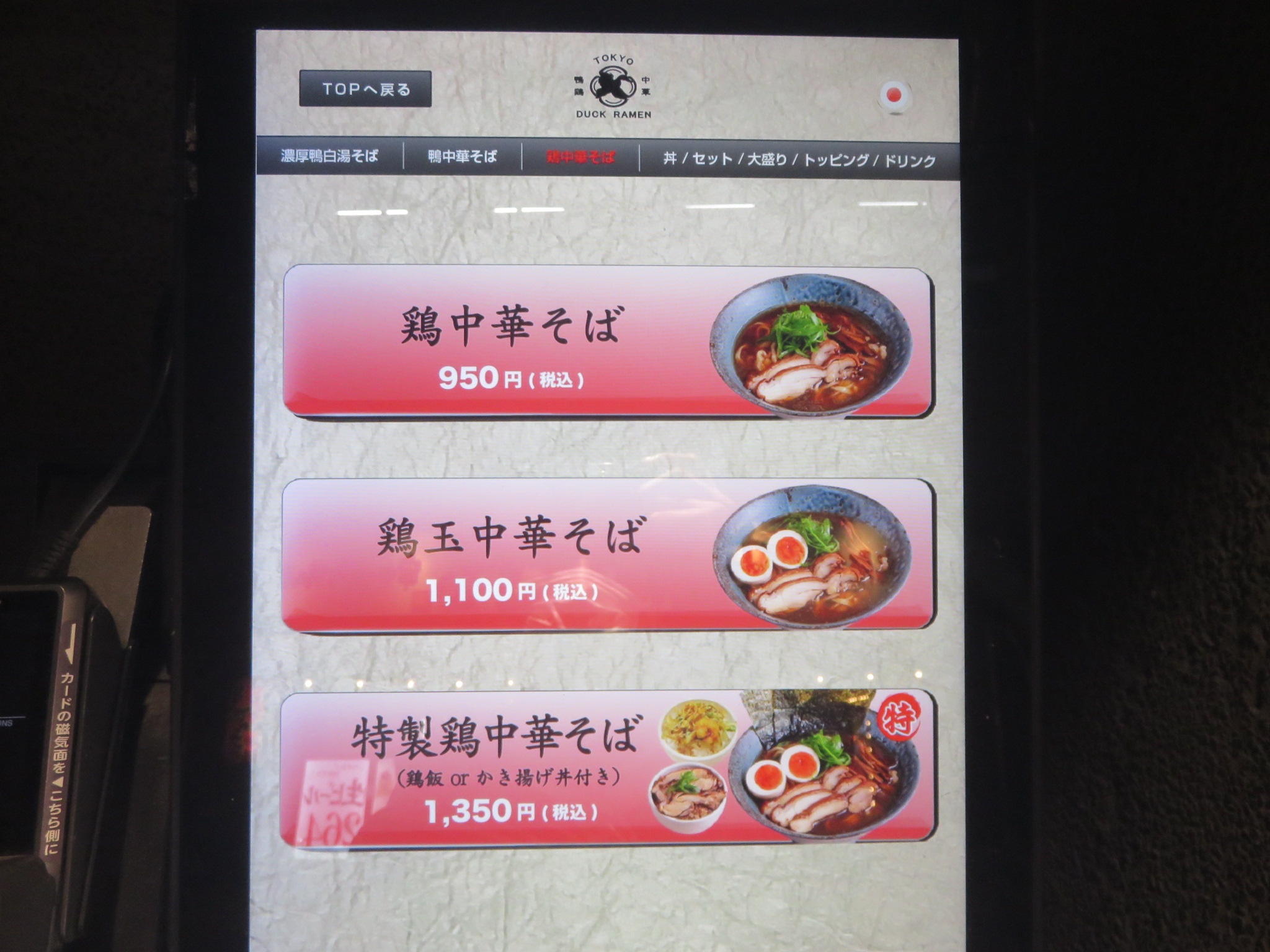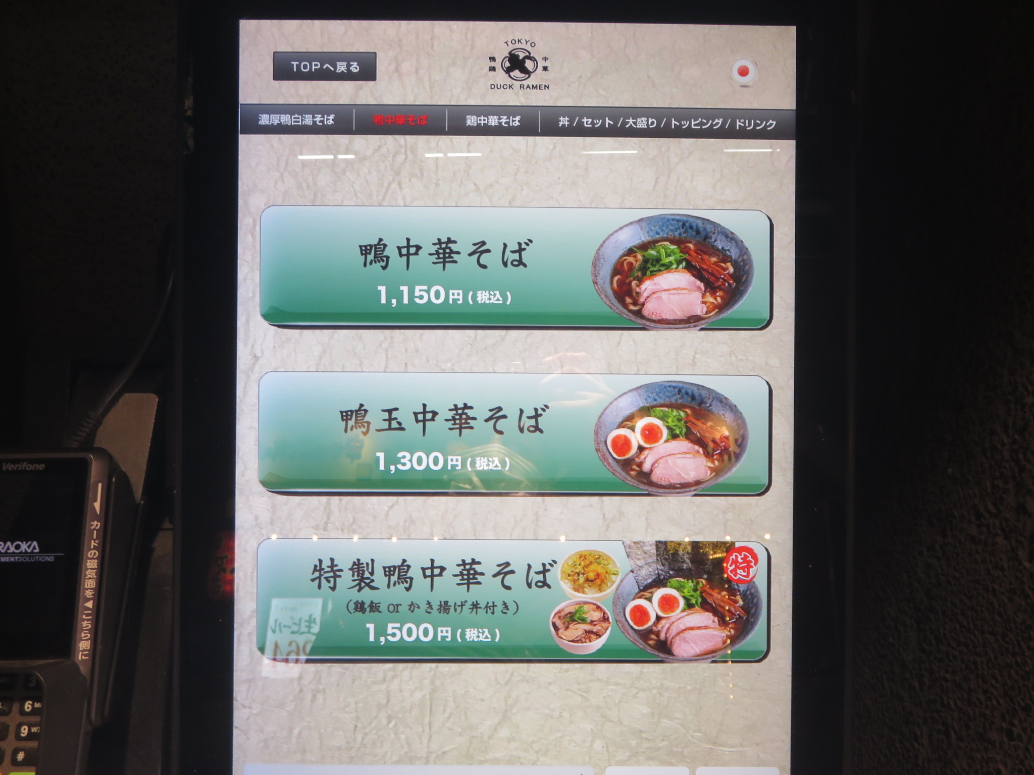 どれにするかかなり悩みますが、ここは基本と思われる鴨中華そばをタップします。
