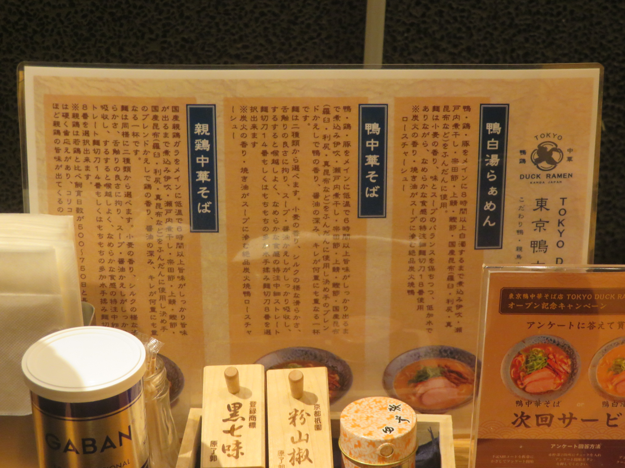 | 具 | 鴨チャーシュー、メンマ、笹切り青ネギ |