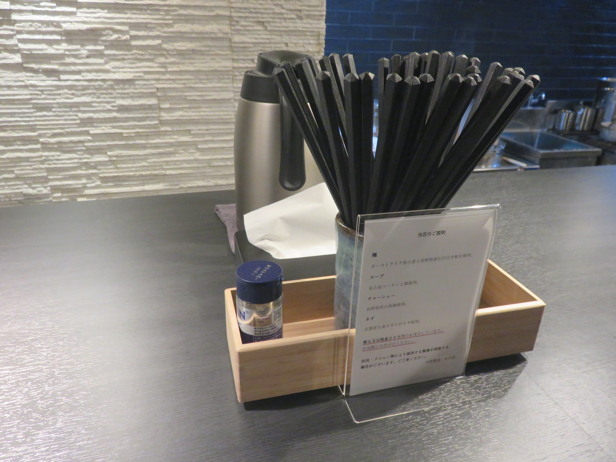 メニューは中華蕎麦、塩らーめん、つけそば、酸辣湯麺、味噌ラーメンのラインアップとなっており、組み合わせで特製、味玉、チャーシューが、麺量が大盛りから選べるようです。