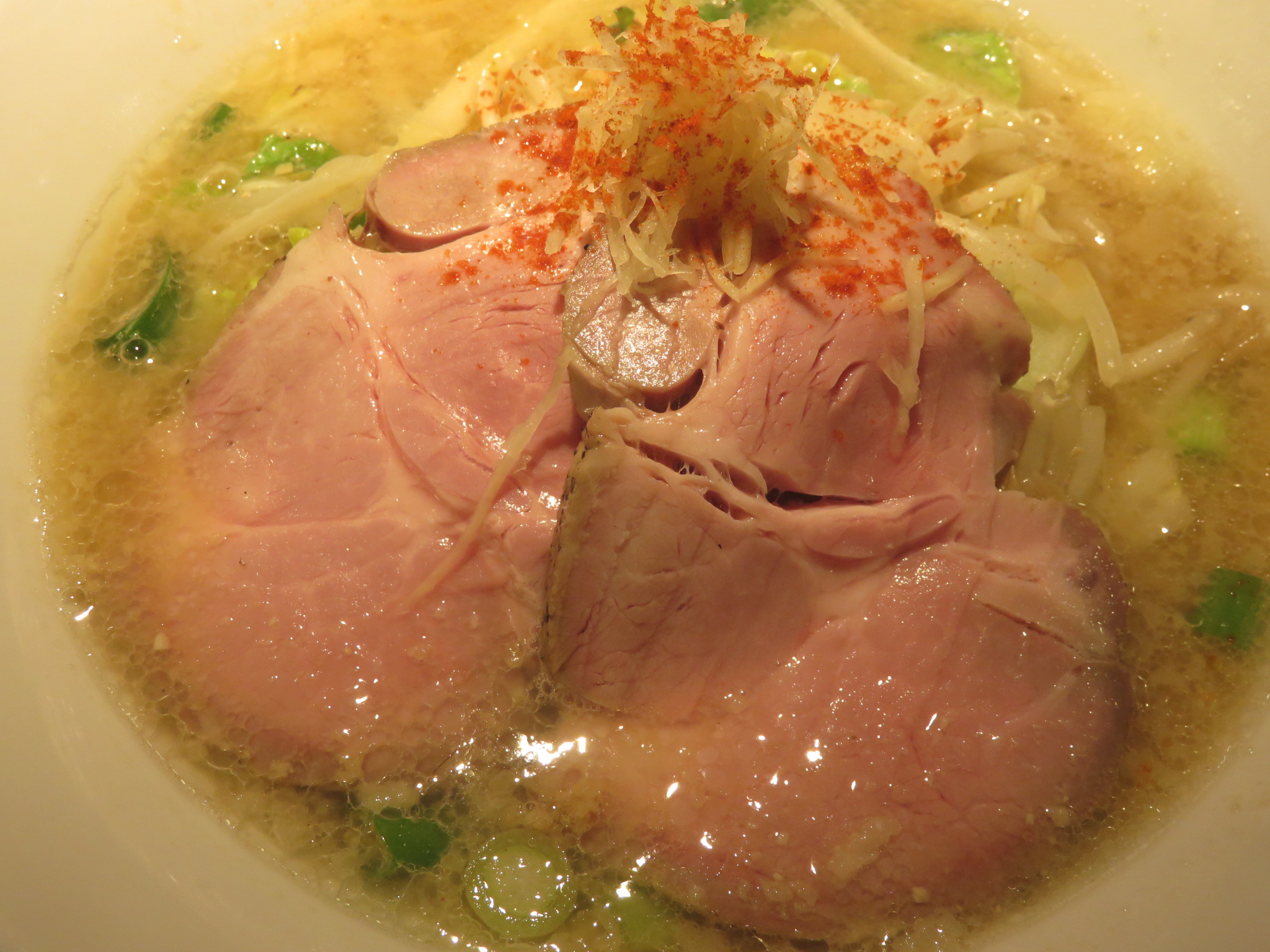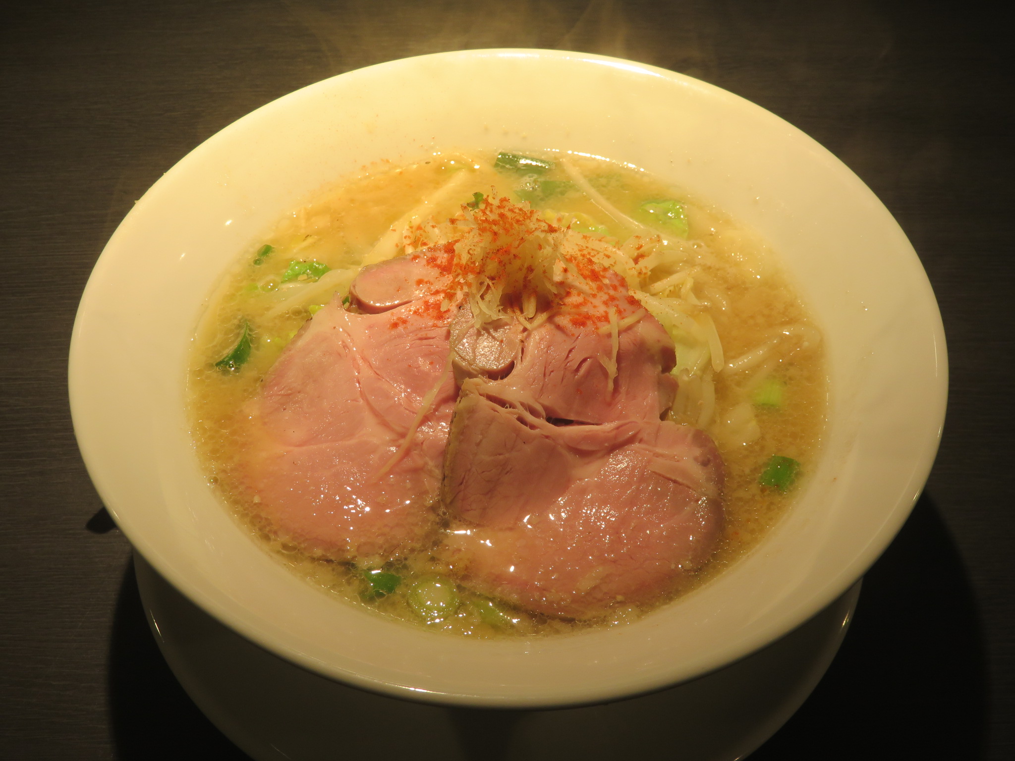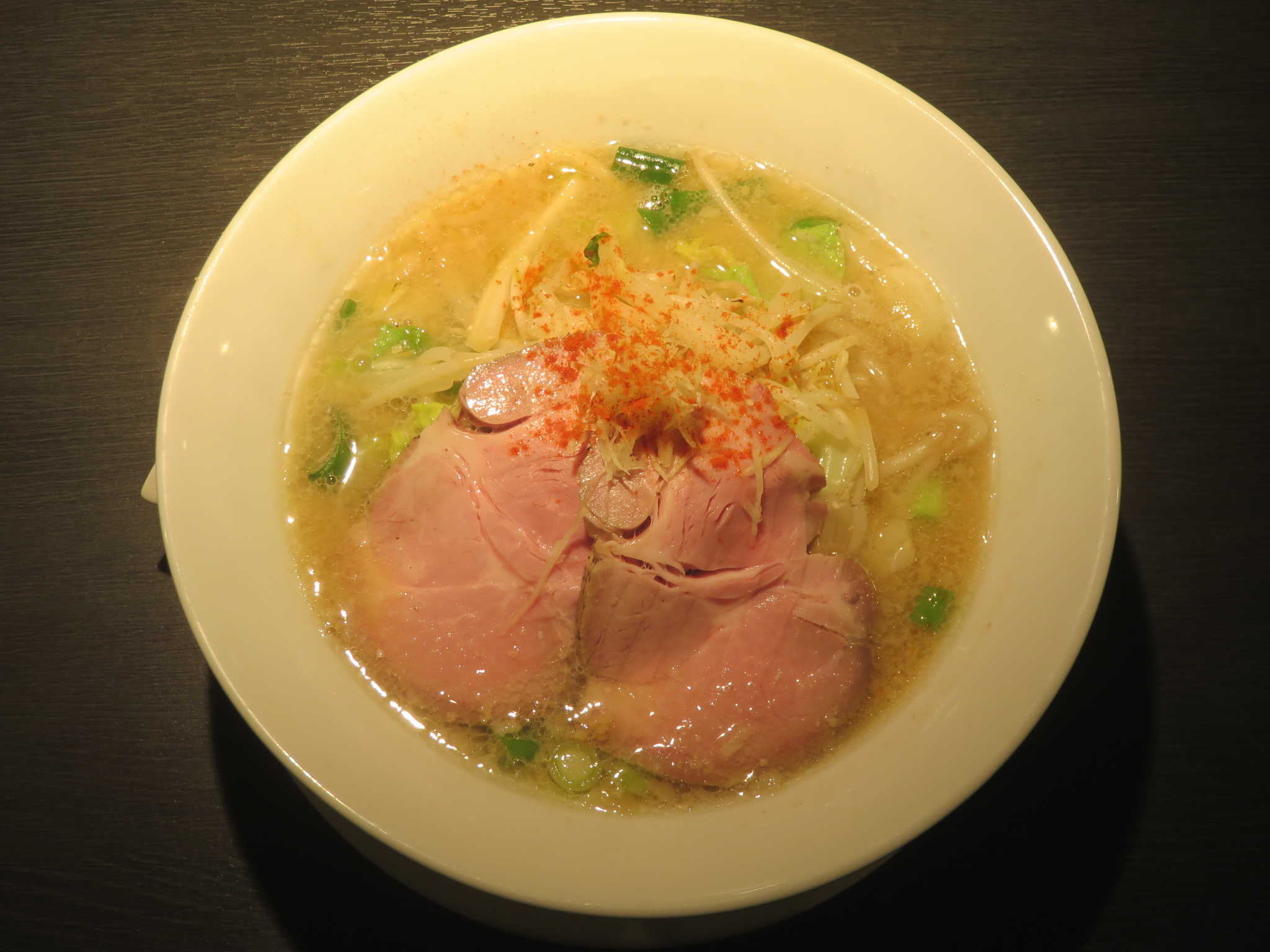 | 具 | 豚チャーシュー、モヤシ、ハクサイ、刻みネギ、針生姜、チリパウダー、背脂 |