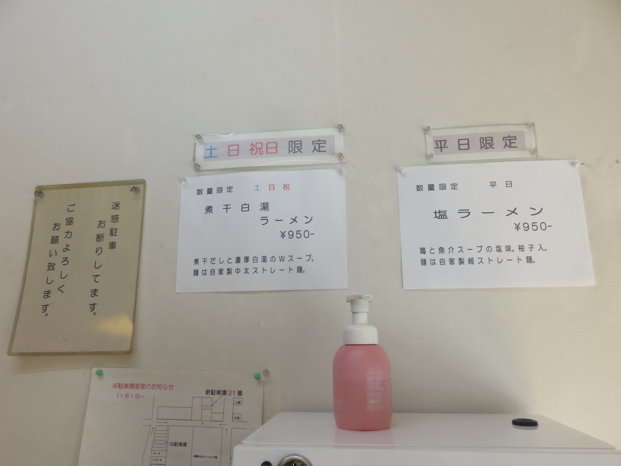 塩ラーメンは平日限定、煮干白湯ラーメンは土日祝限定となっていました。