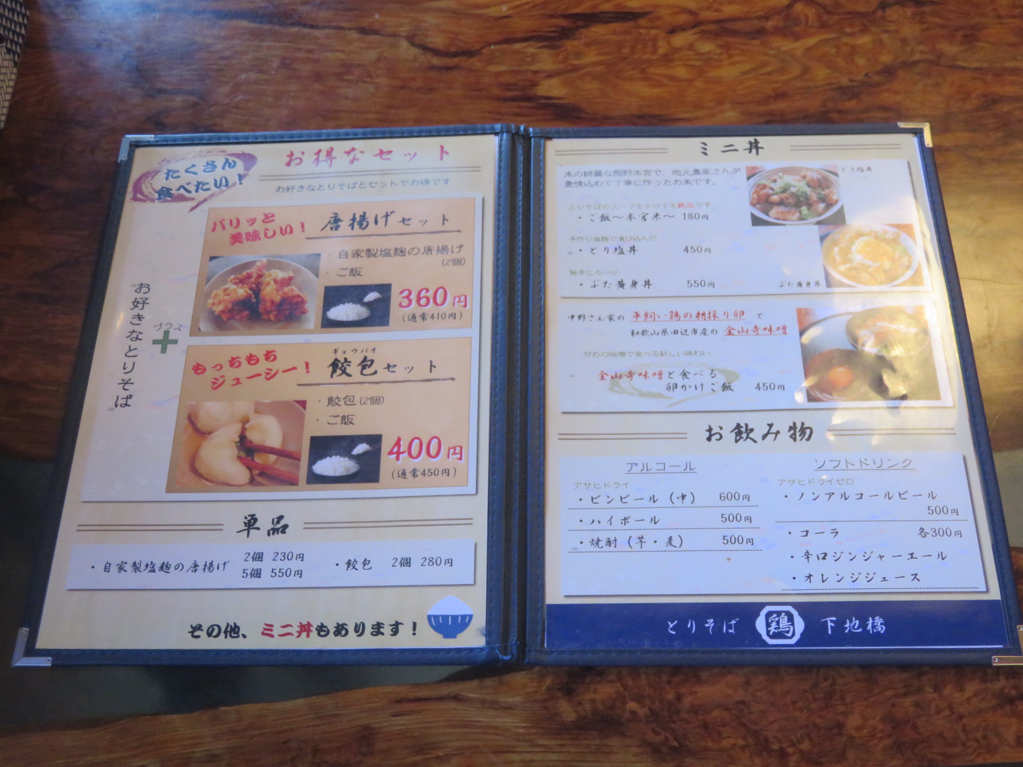 メニューは塩とりそば、鴨醤油とりそば、オトナの味噌とりそば、くまの牛醤油とりそば、つけ麺のラインアップとなっており、組み合わせで煮玉子ぬきが選べるようです。