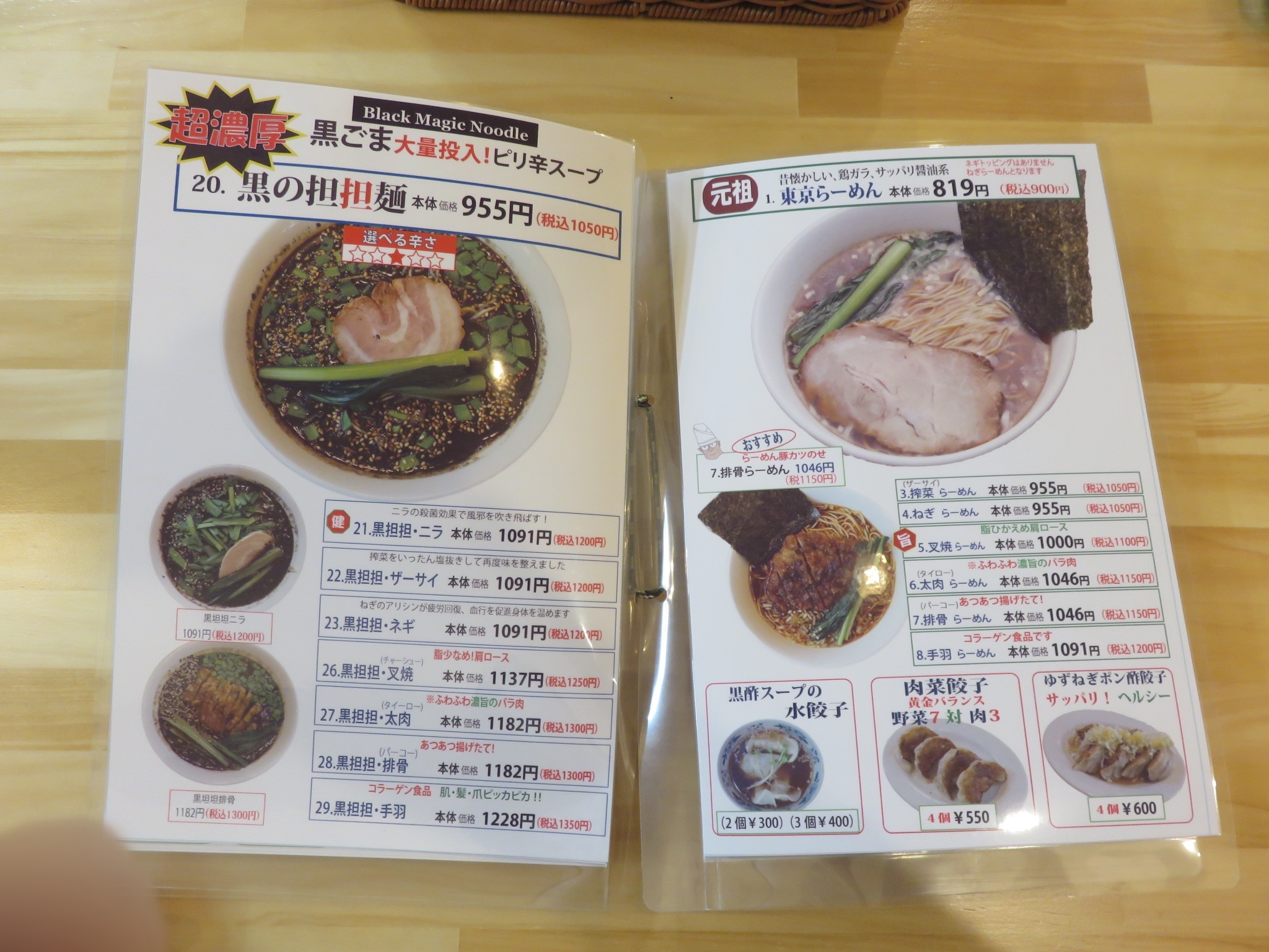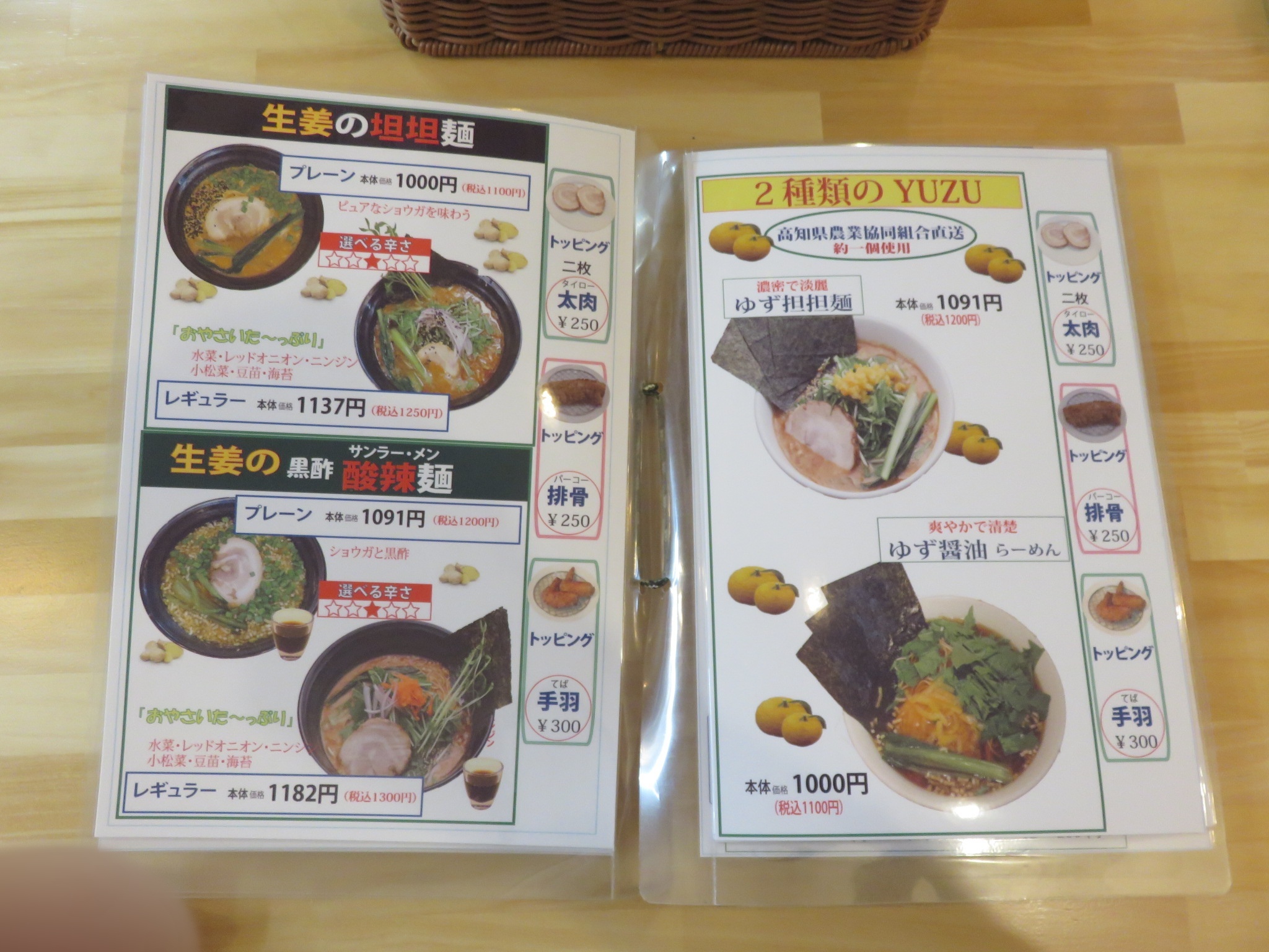 メニューは担々麺、金の担々麺、黒酢の酸辣麺、黒の担々麺、東京らーめん、生姜の担々麺、生姜の黒酢酸辣麺、ゆず担々麺、ゆず醤油らーめんのラインアップとなっており、組み合わせでニラ、ザーサイ、ネギ、叉焼、太肉、排骨、手羽、プレーン、レギュラーから選べるようです。