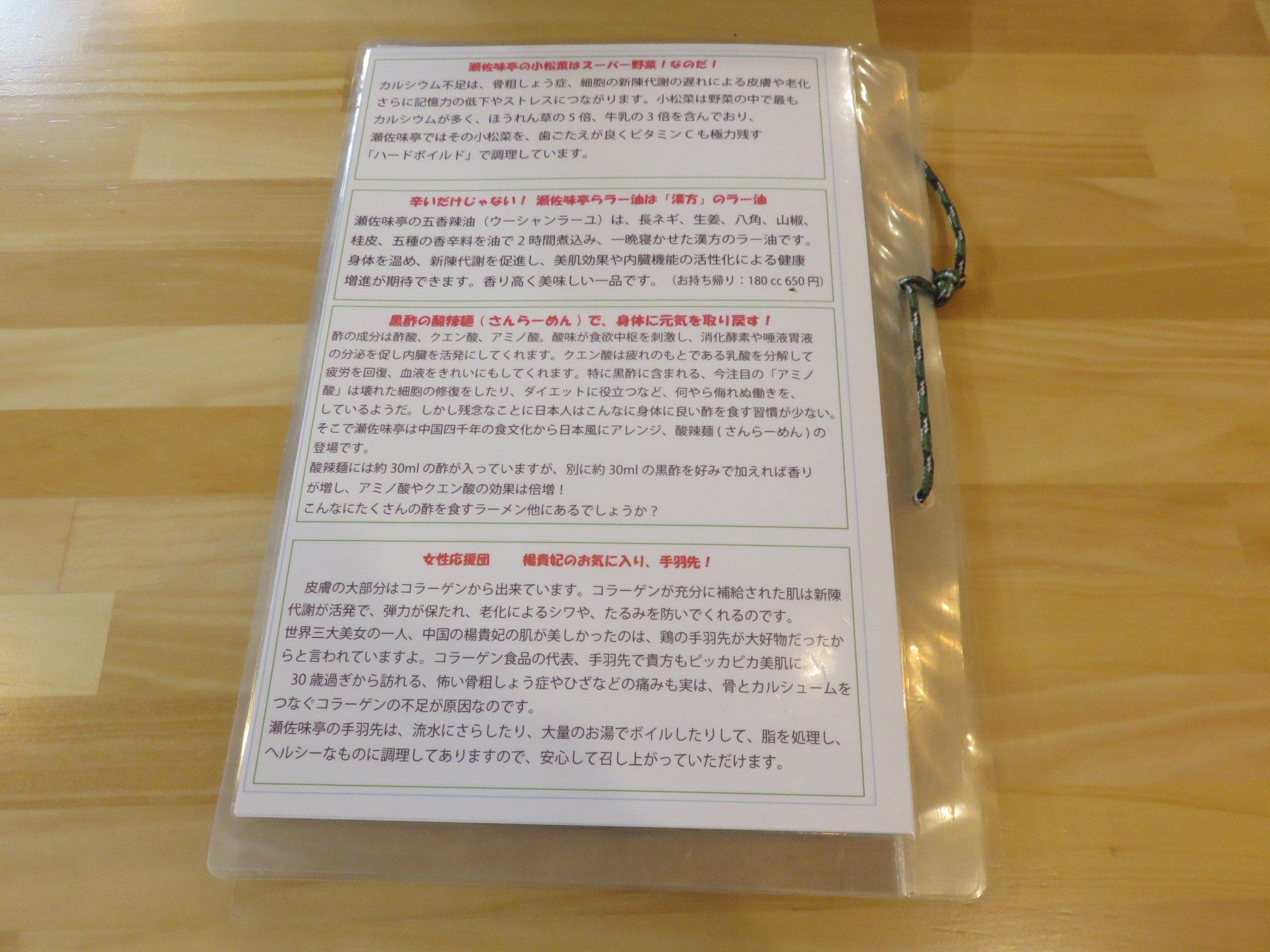 | 具 | 豚チャーシュー、排骨、青梗菜、刻みニラ、微塵切りネギ、柚子皮 |