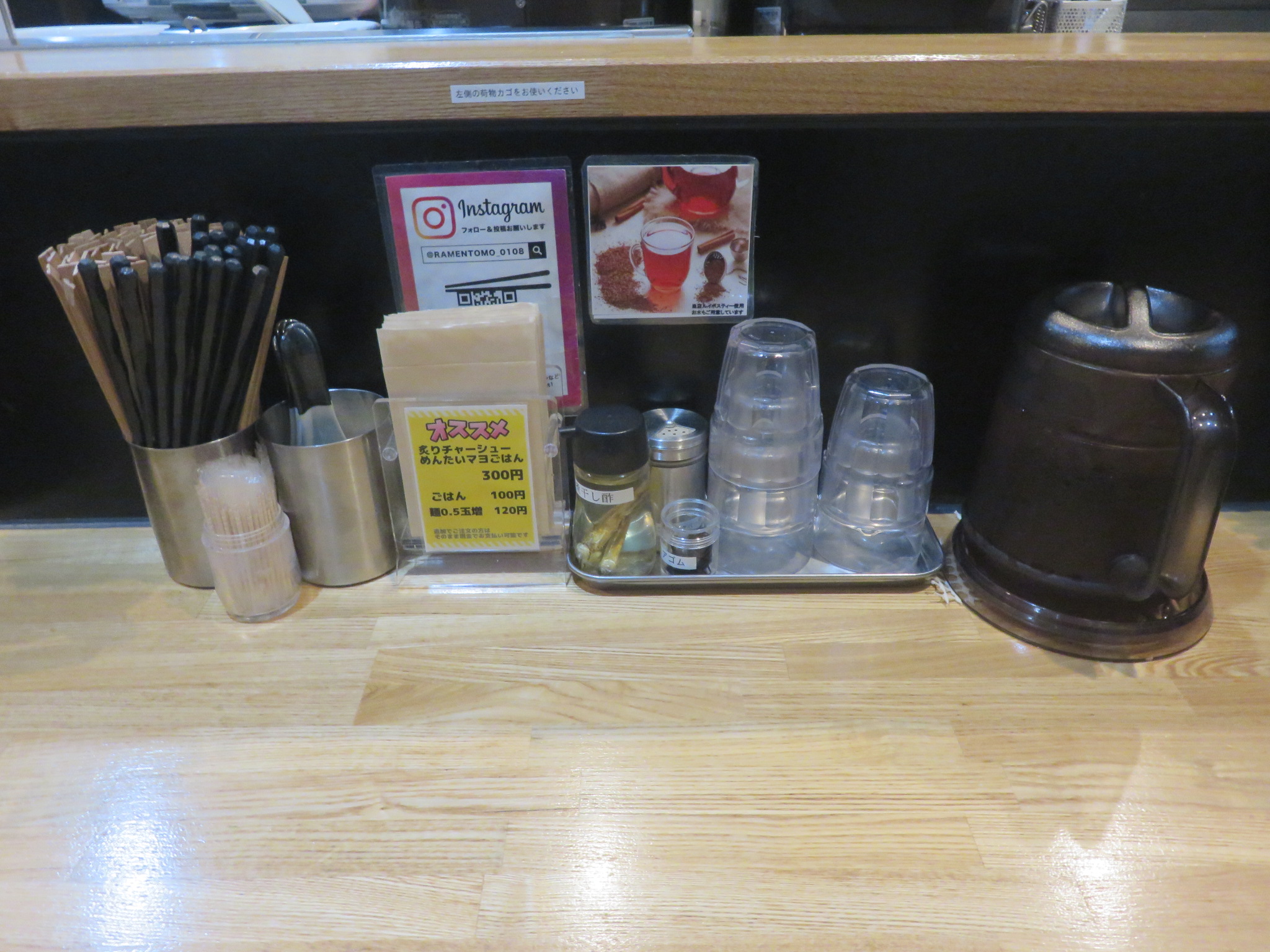 | 具 | 鶏チャーシュー、豚チャーシュー、肉ワンタン、海老ワンタン、メンマ、刻み青ネギ、揚げネギ、別皿:岩海苔 |