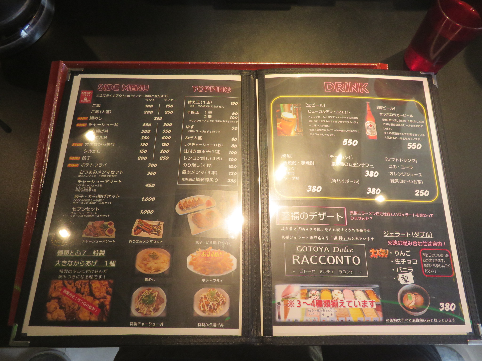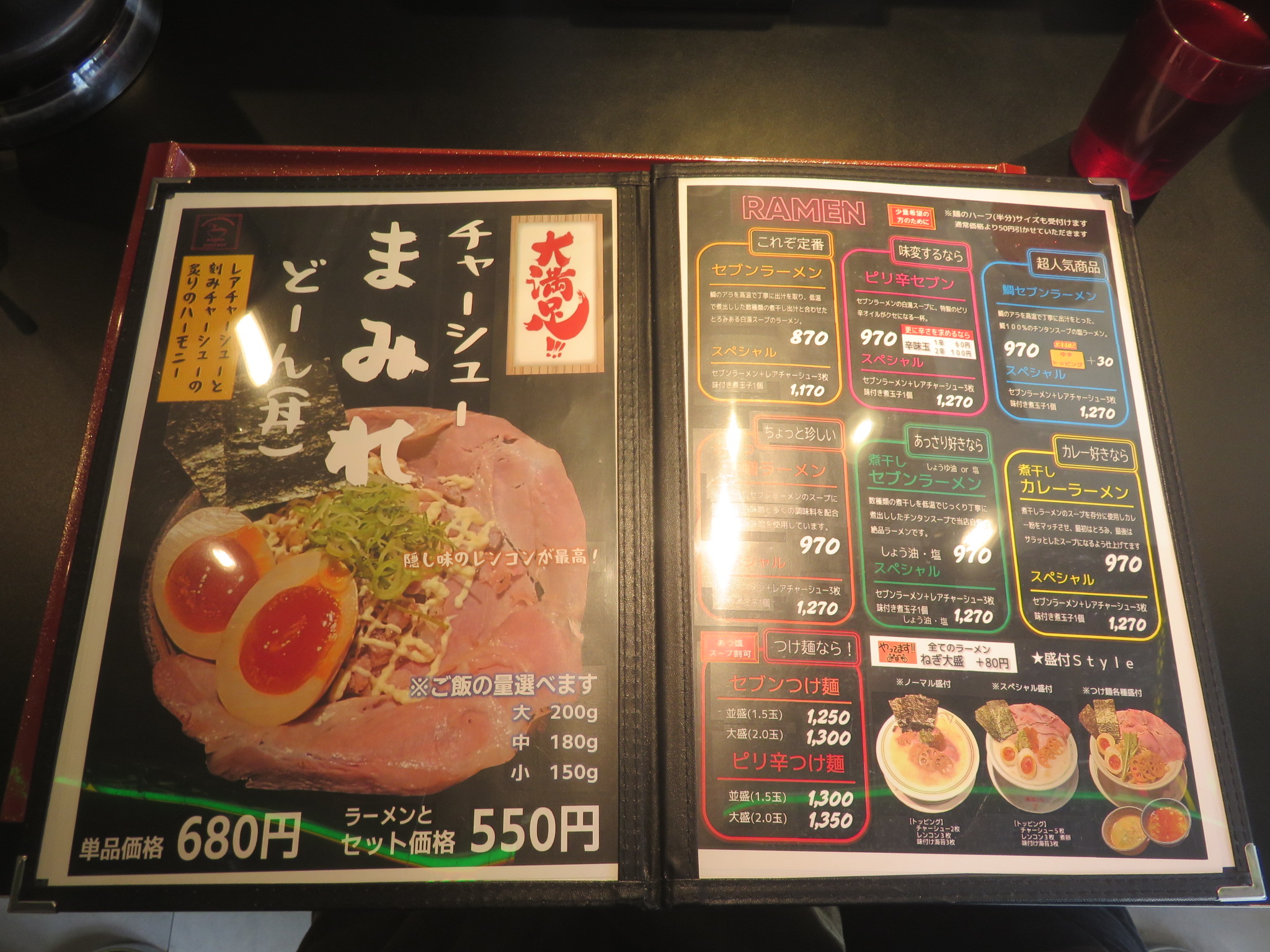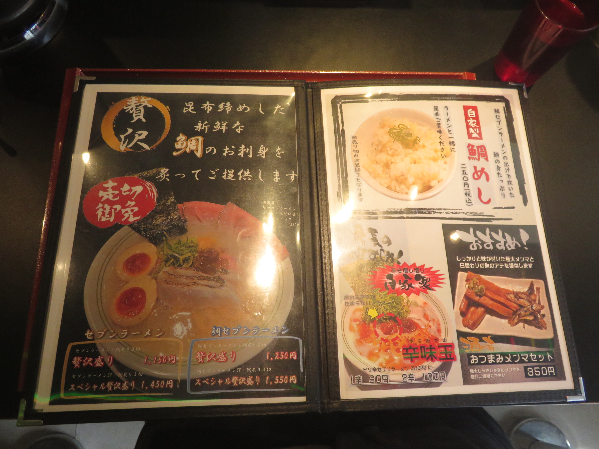 メニューはセブンラーメン、ピリ辛セブン、鯛セブンラーメン、泡立つ味噌ラーメン、煮干しセブンラーメン、煮干しカレーラーメン、セブンつけ麺、ピリ辛つけ麺のラインアップとなっており、組み合わせでスペシャル、贅沢盛り、スペシャル贅沢盛りが、麺量が並盛、大盛から、味の種類がしょう油、塩から選べるようです。
