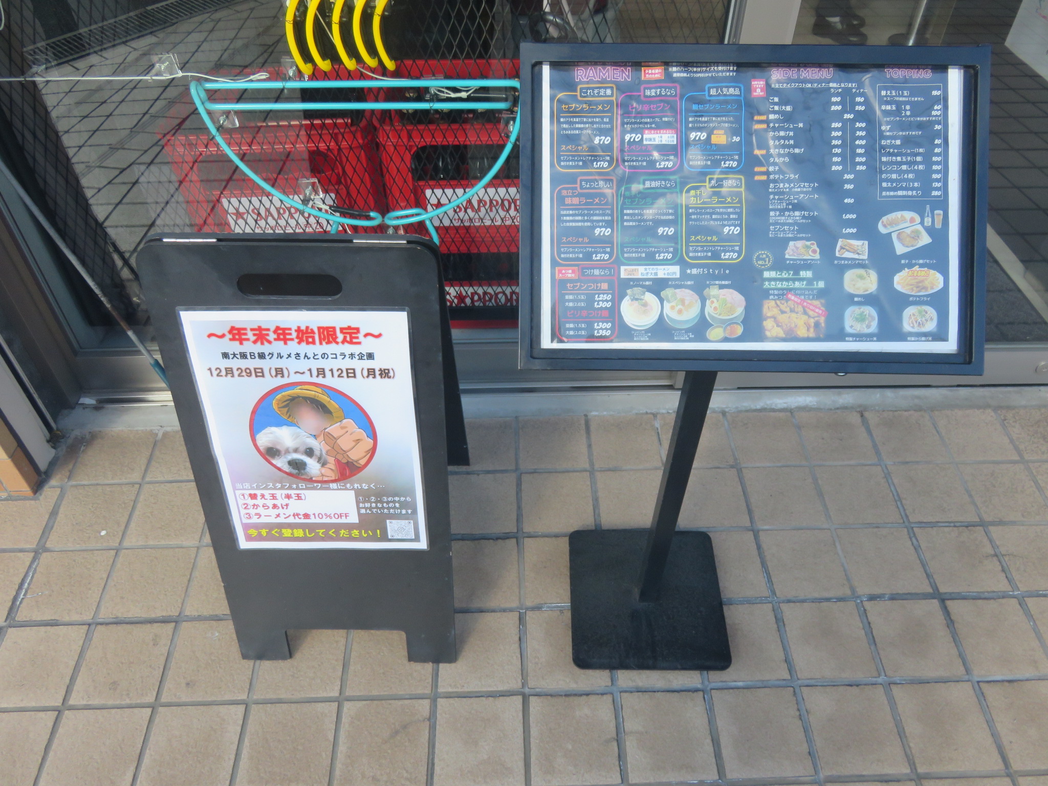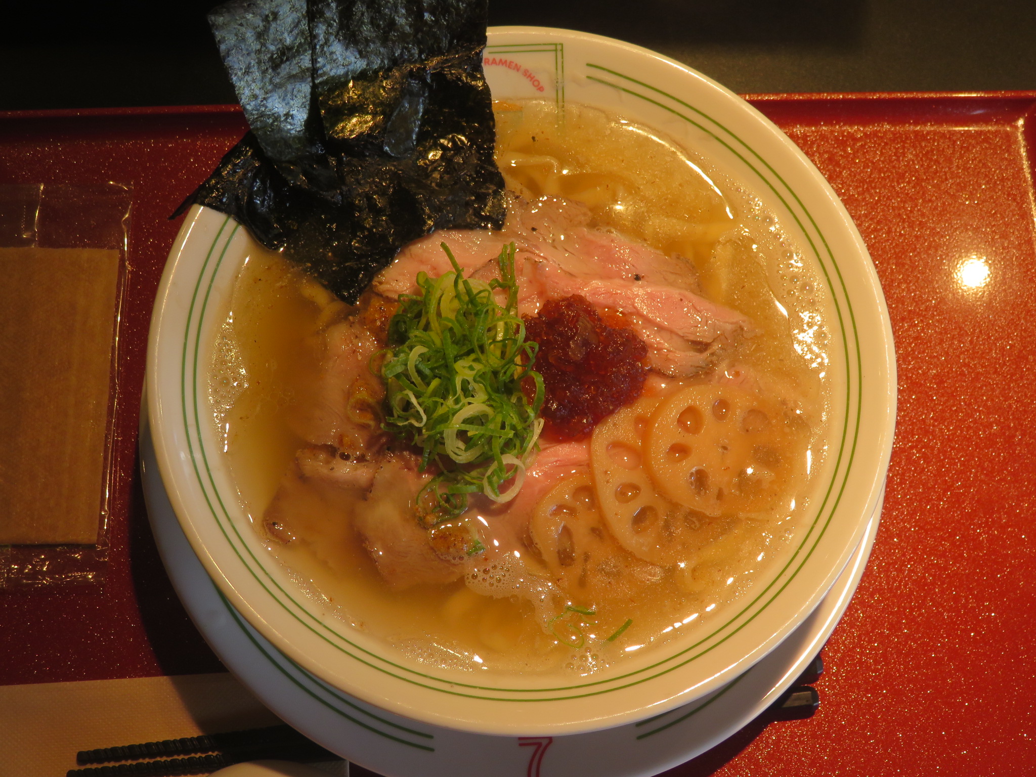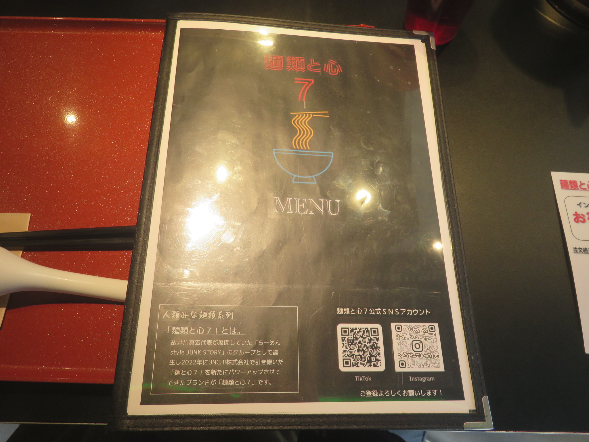 メニューはセブンラーメン、ピリ辛セブン、鯛セブンラーメン、泡立つ味噌ラーメン、煮干しセブンラーメン、煮干しカレーラーメン、セブンつけ麺、ピリ辛つけ麺のラインアップとなっており、組み合わせでスペシャル、贅沢盛り、スペシャル贅沢盛りが、麺量が並盛、大盛から、味の種類がしょう油、塩から選べるようです。