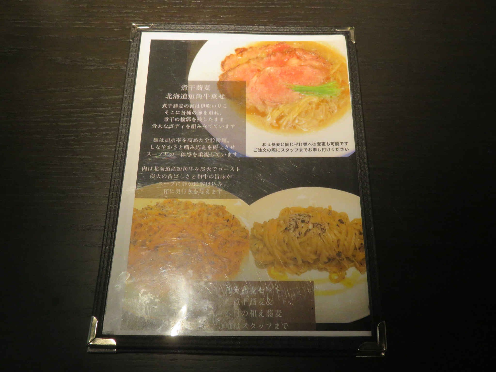メニューは煮干蕎麦 北海道短角牛リブロース乗せのみのラインアップとなっており、本日の和え蕎麦とのセットが選べるようです。