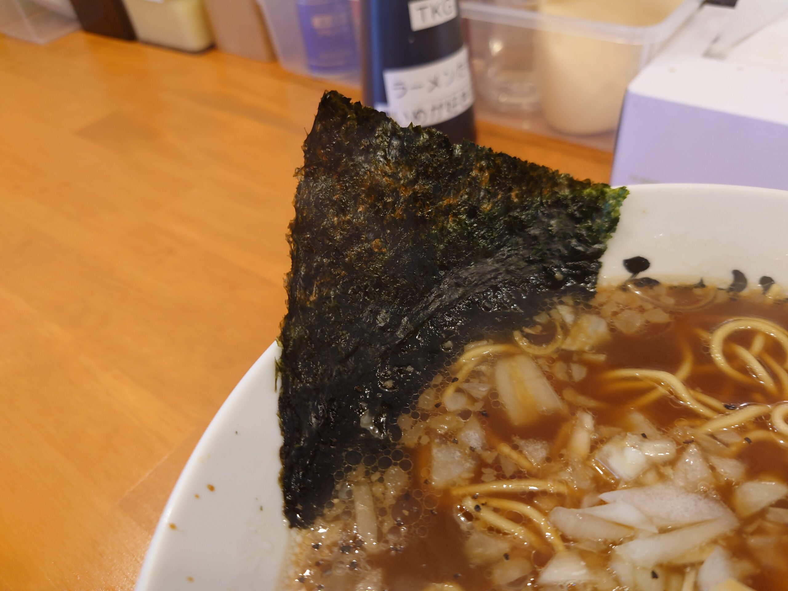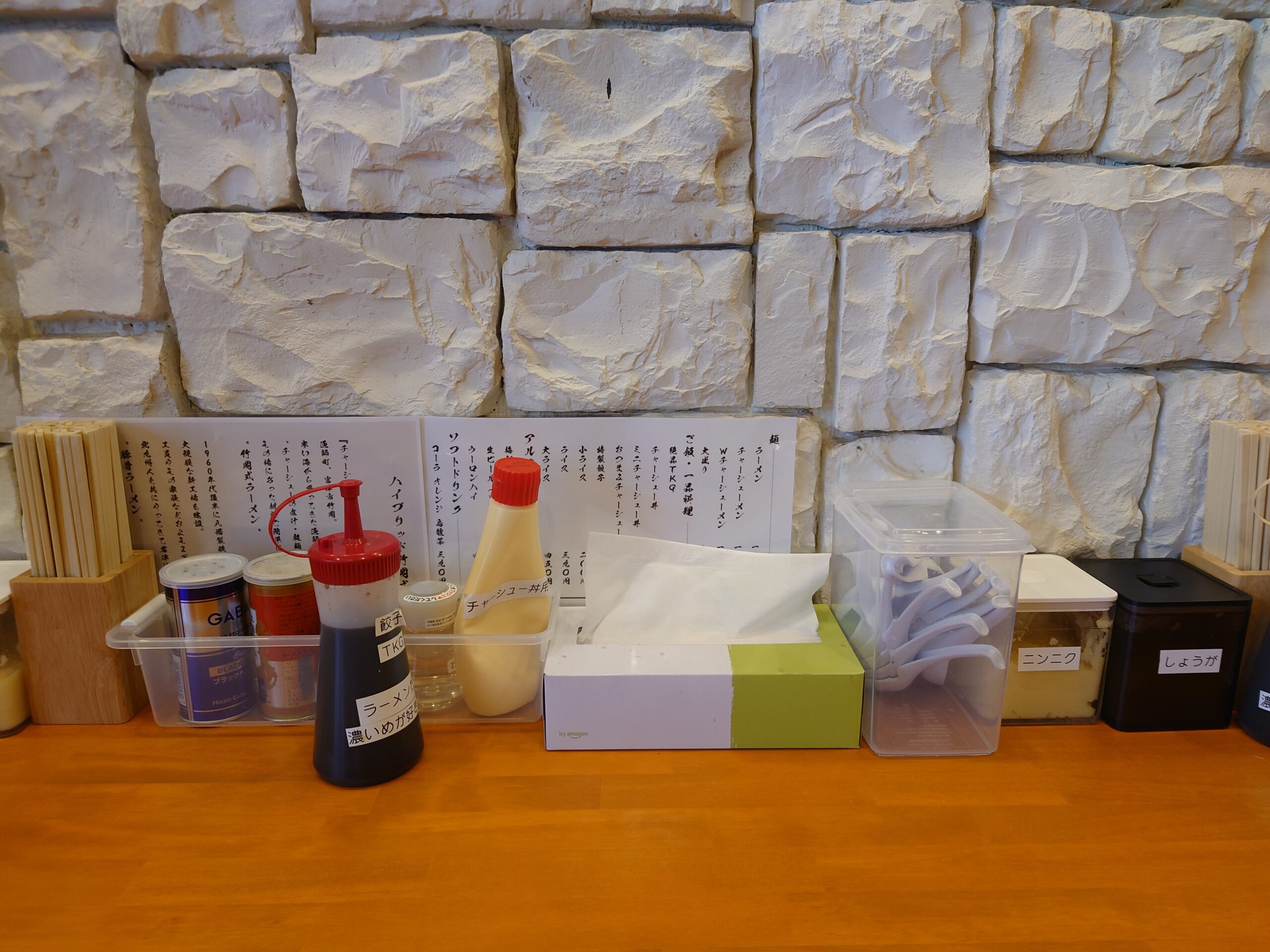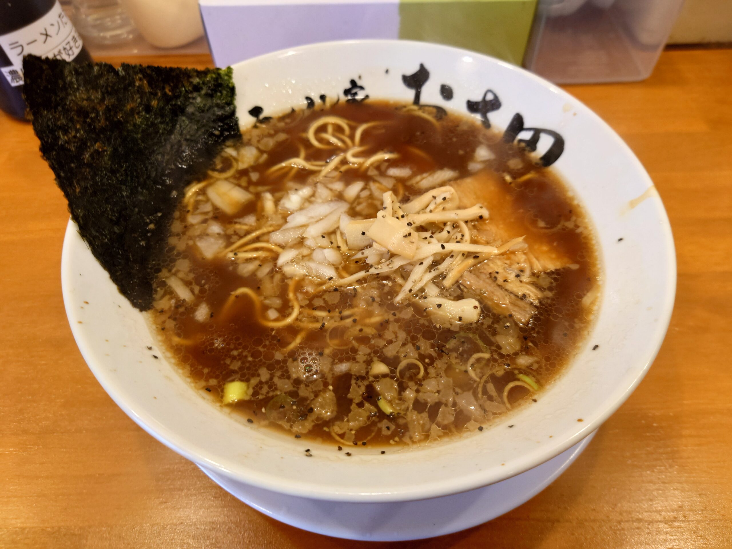 | 具 | 豚チャーシュー、裂きメンマ、刻みタマネギ、刻みネギ、海苔 |