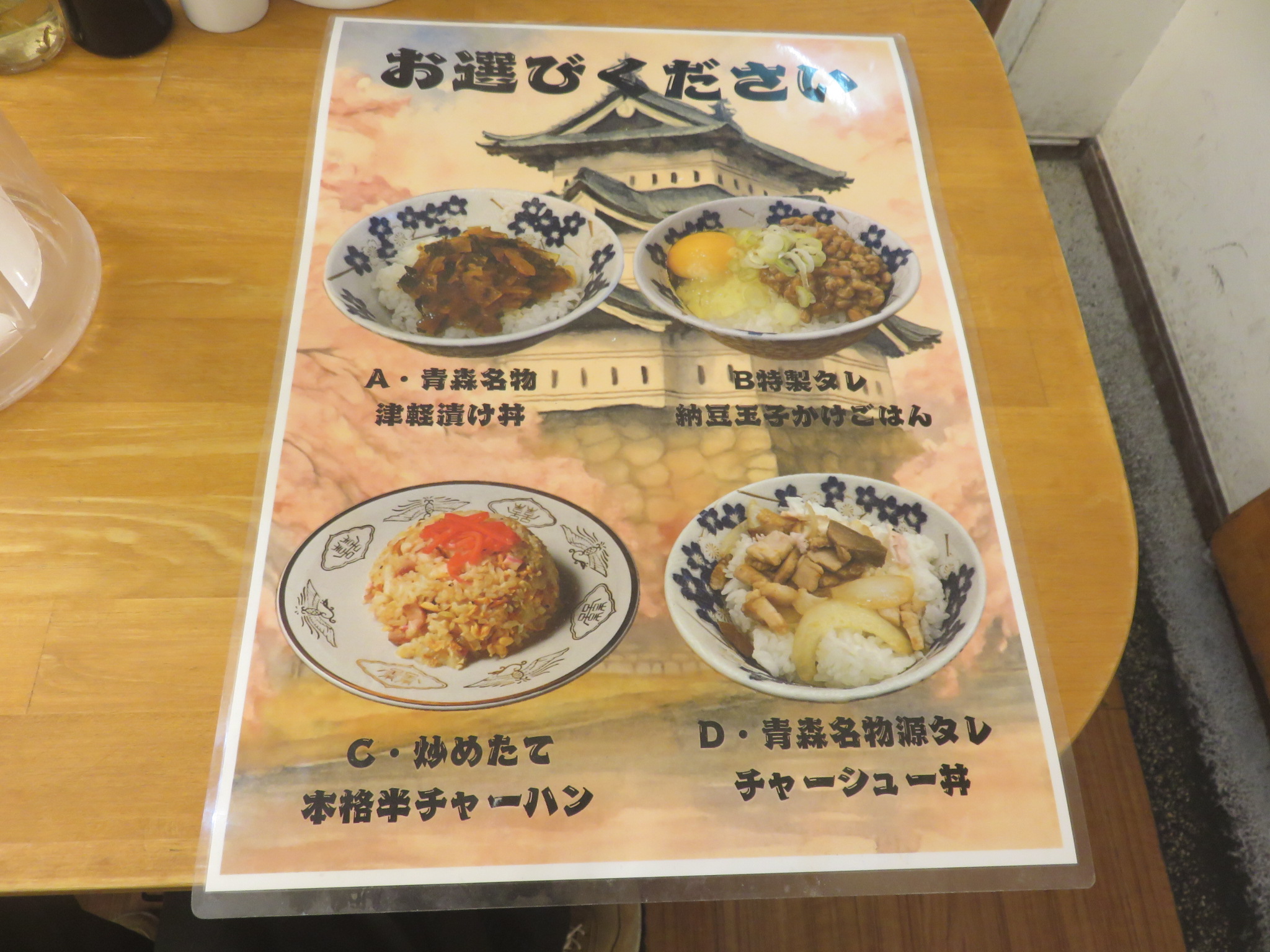 津軽名物津軽漬け丼、B特製ダレ納豆玉子がけごはん、炒めたて本格半チャーハン、青森名物源タレチャーシュー丼から選べるようで、津軽名物津軽漬け丼お願いしてみます。