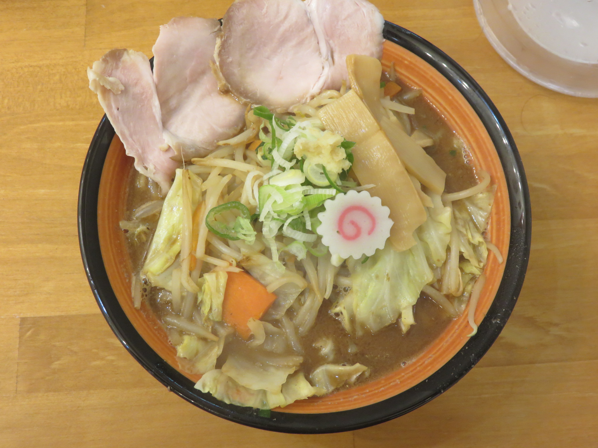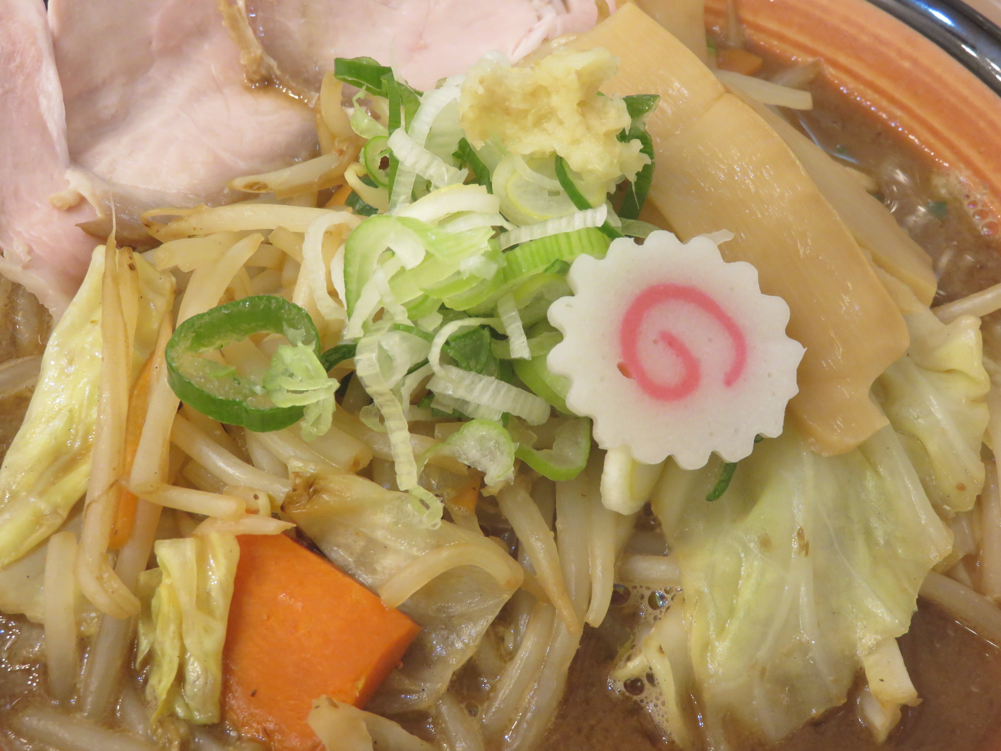 豚チャーシュー、メンマ、ナルト、モヤシ、キャベツ、ニンジン、刻みネギ、おろし生姜