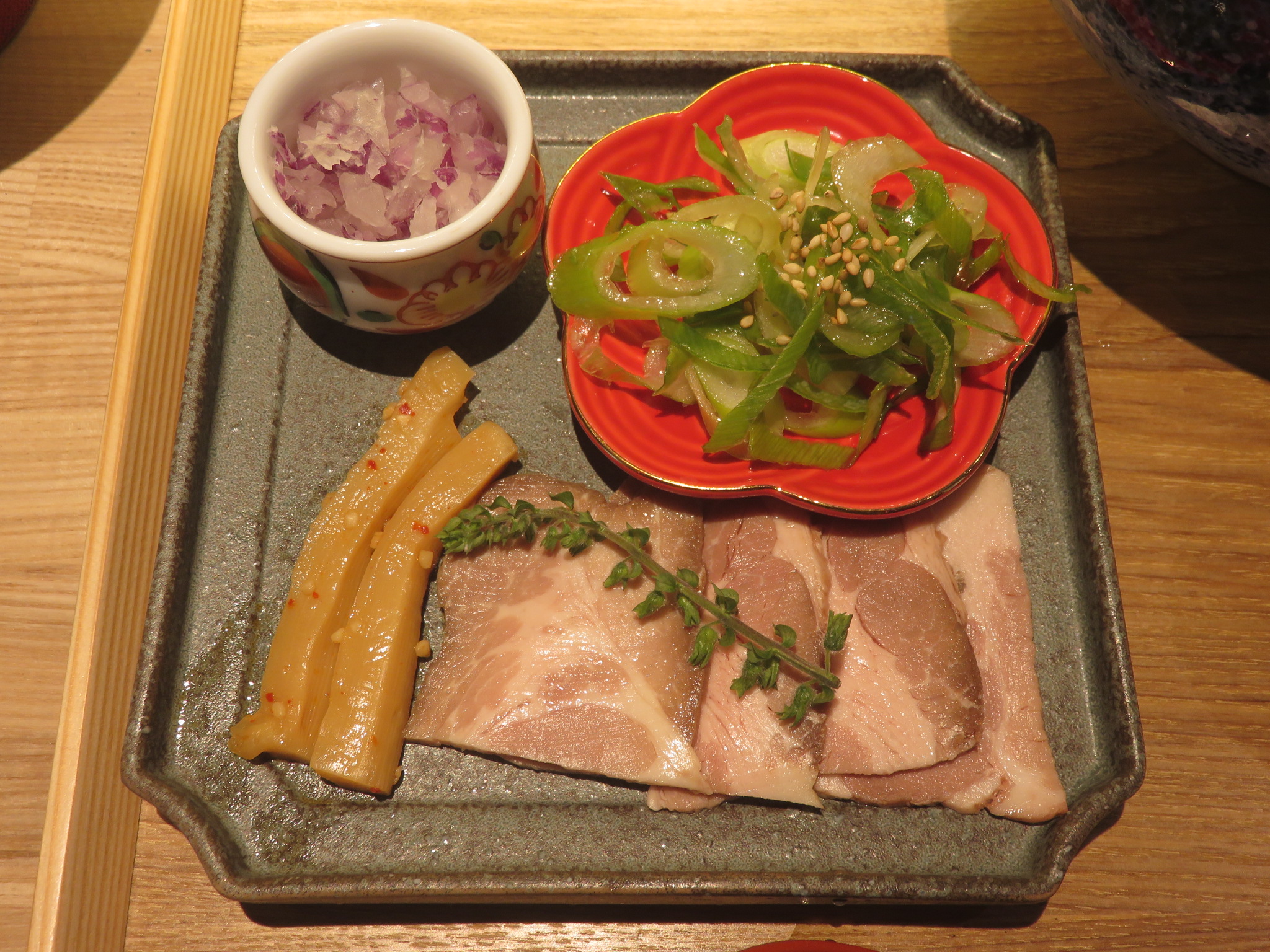 別皿:豚チャーシュー、別皿:メンマ、別皿:微塵切り紫タマネギ、別皿:笹切りネギ、別皿:胡麻、別皿:穂紫蘇、別皿:鰹節