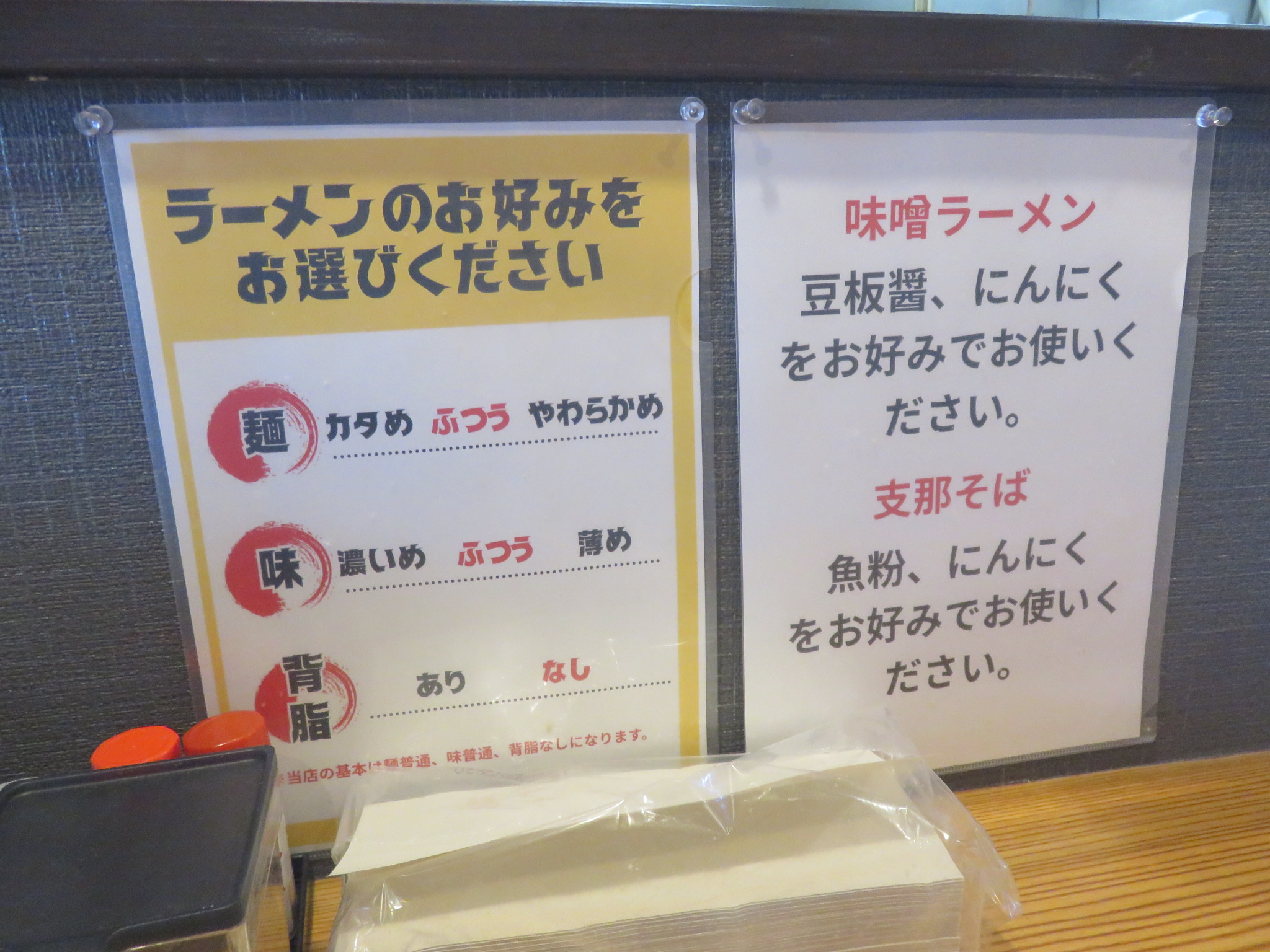 メニューは熟成味噌ラーメン、支那そば醤油、支那そば塩、とんこつラーメン醤油、とんこつラーメン味噌のラインアップとなっています。