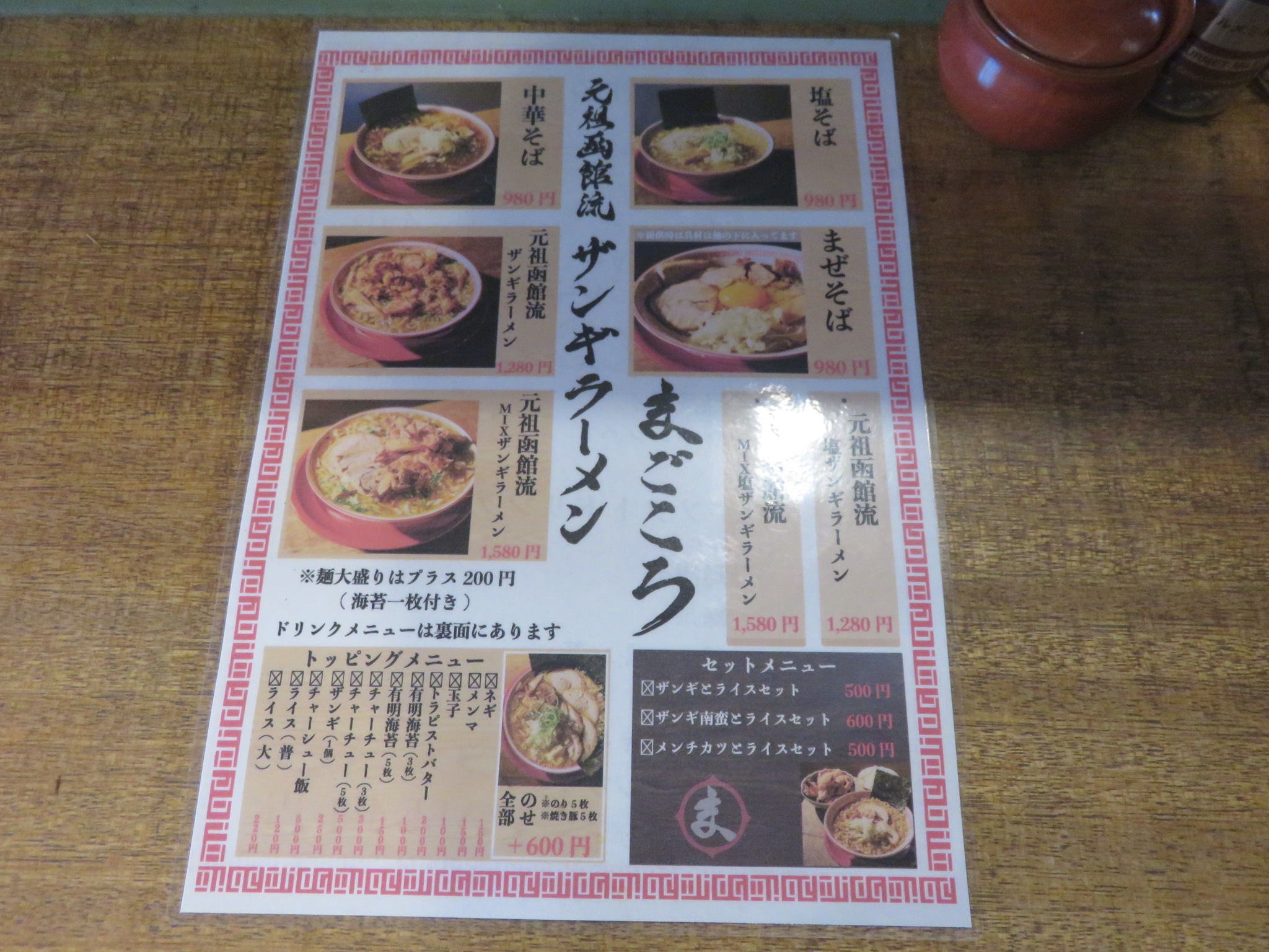 メニューは中華そば、まぜそば、塩そば、まごころ流味噌ラーメン、函館トラピストバター味噌ラーメンのラインアップとなっており、組み合わせで元祖函館流ザンギ、元祖函館流MIXザンギが選べるようです。