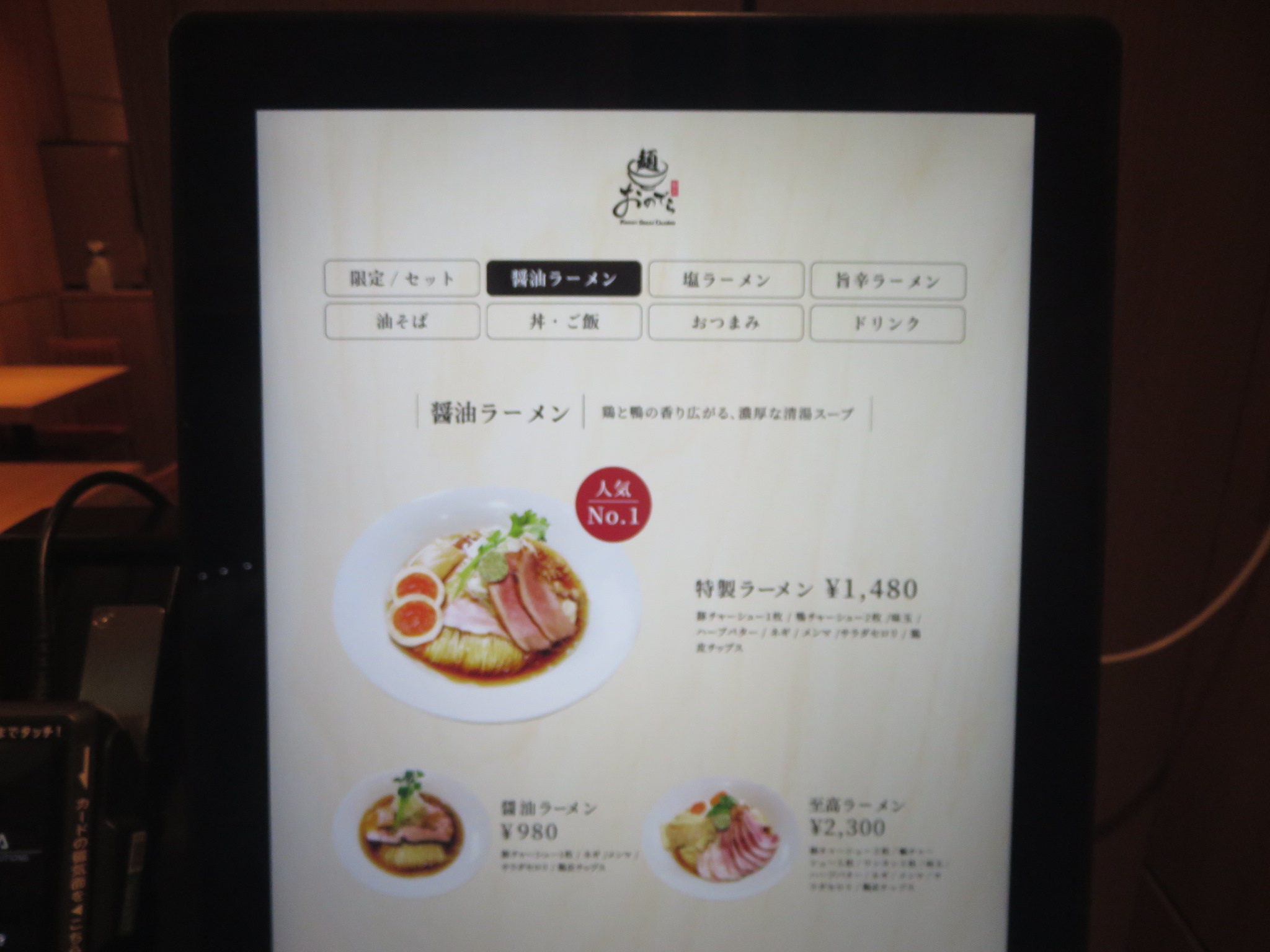 どれにするか悩みますが、表参道では醤油ラーメンを食したことから塩ラーメンをタップします。
