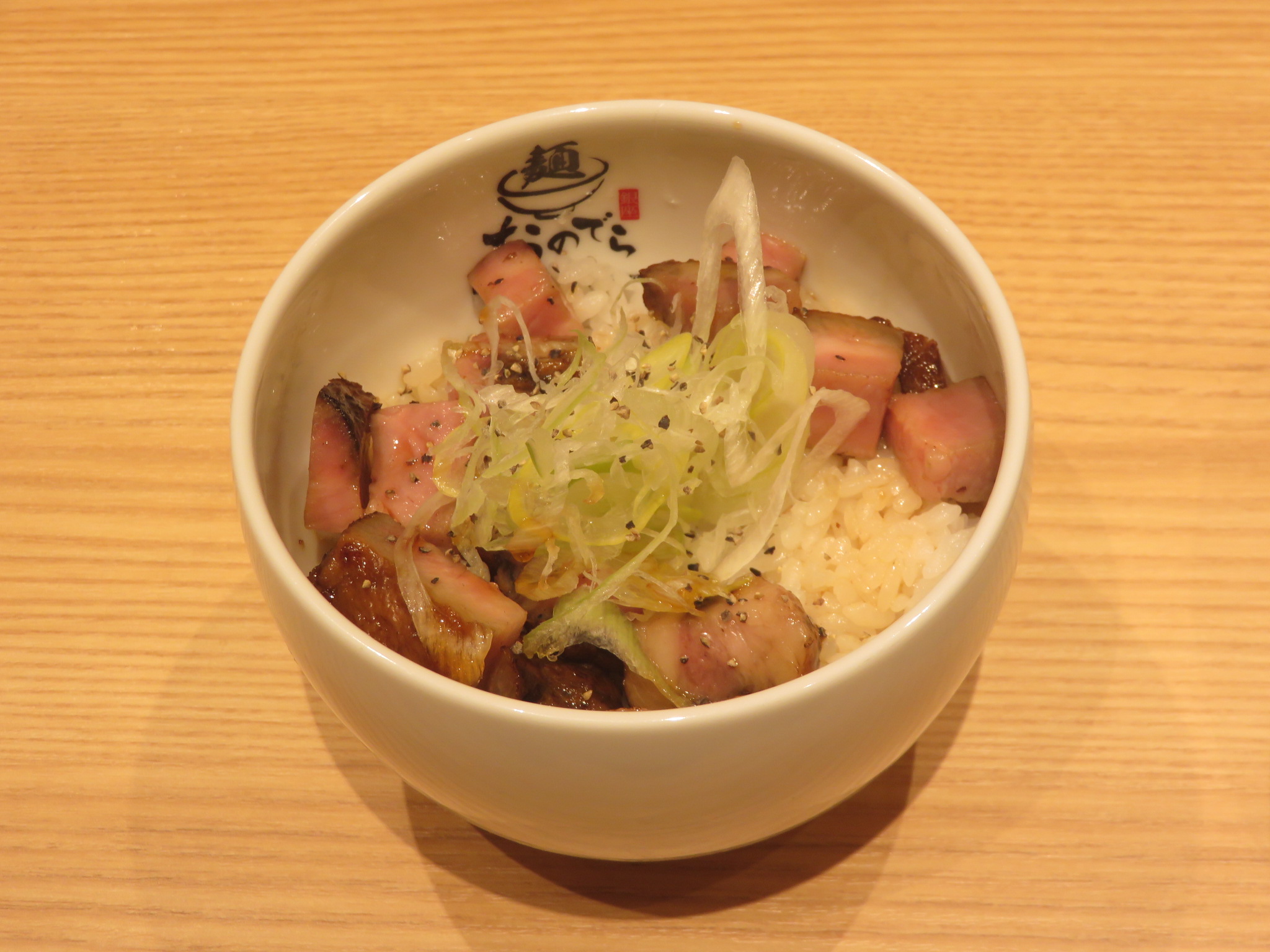 ご飯の上にカットされた豚チャーシューと刻み白ネギが乗っています。