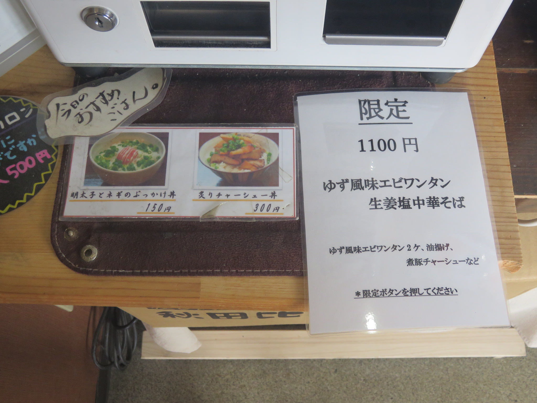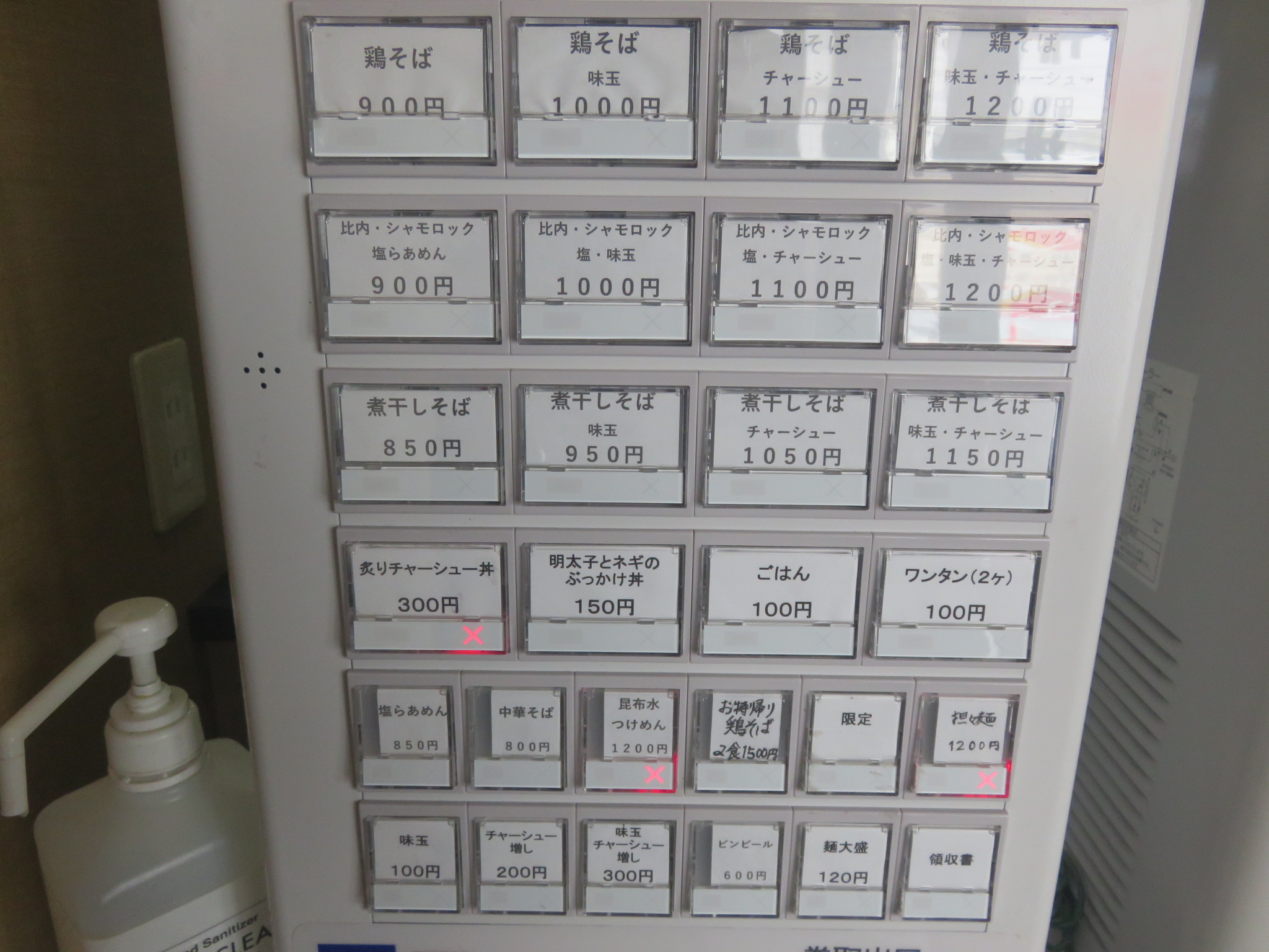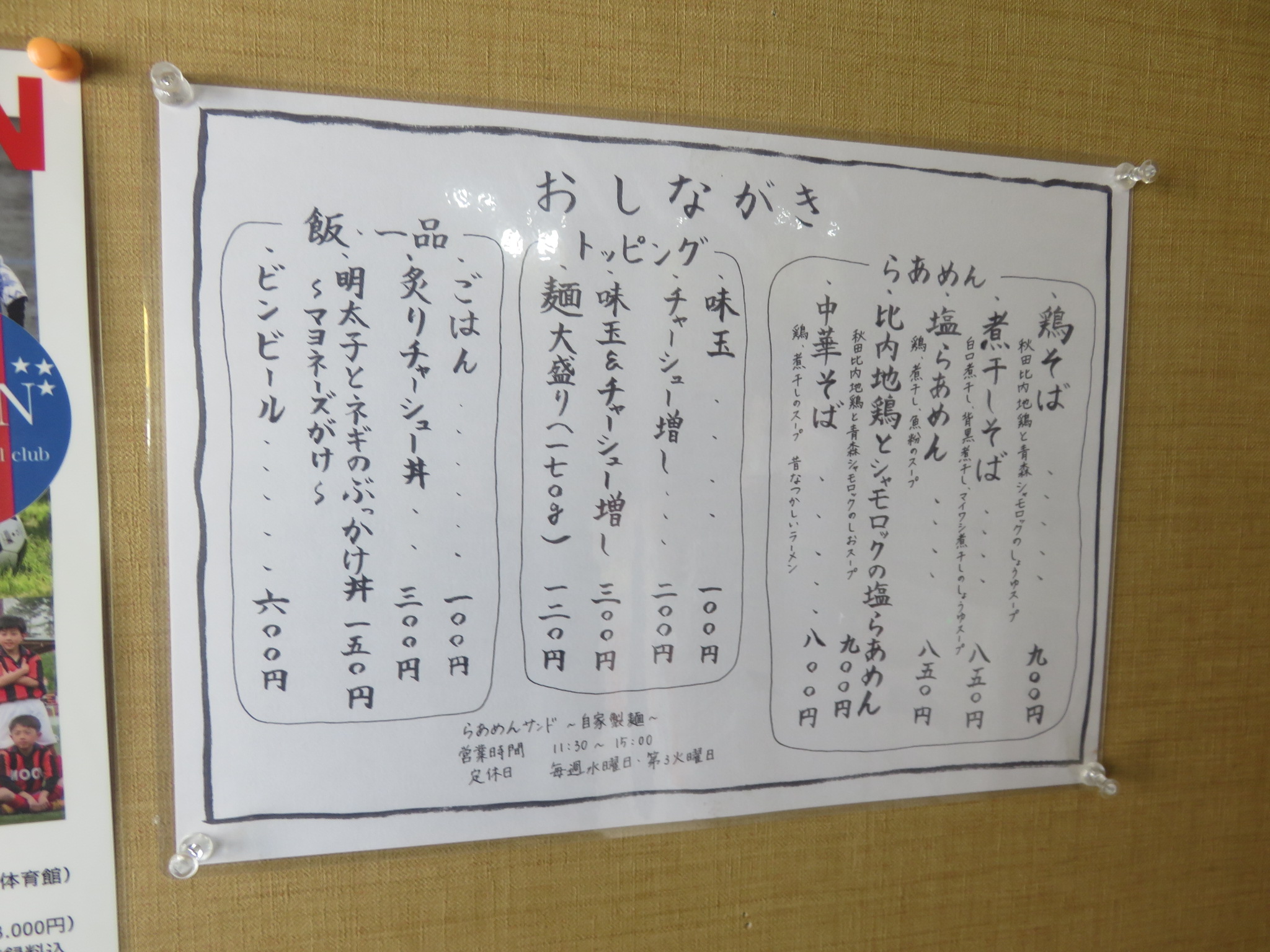 メニューは鶏そば、比内地鶏とシャモロックの塩らあめん、煮干しそば、塩らあめん、中華そば、昆布水つけ麵、ゆず風味海老ワンタン生姜塩中華そばのラインアップとなっており、組み合わせで味玉、チャーシュー、味玉・チャーシューが選べるようです。