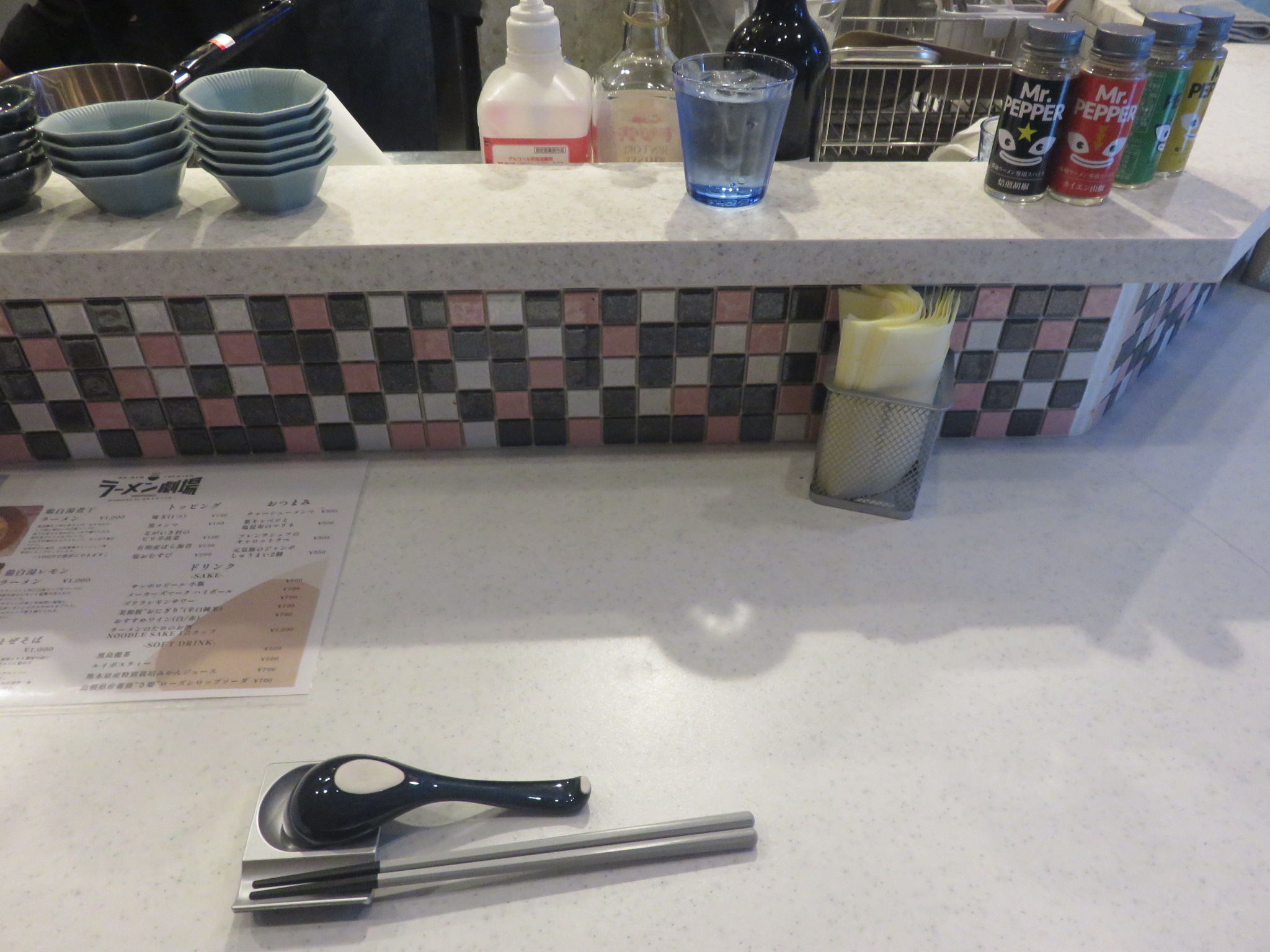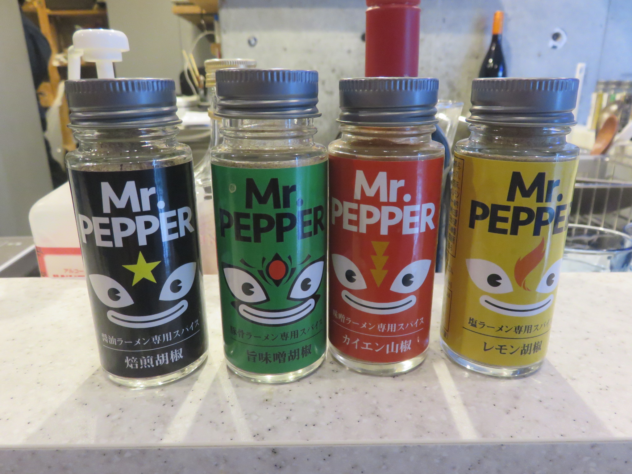 中盤からは劇団員のスタッフさんのおすすめもあり、卓上の醤油ラーメン専用焙煎胡椒、豚骨ラーメン専用旨味味噌、味噌ラーメン専用カイエン山椒、塩ラーメン専用レモン胡椒をお試し。