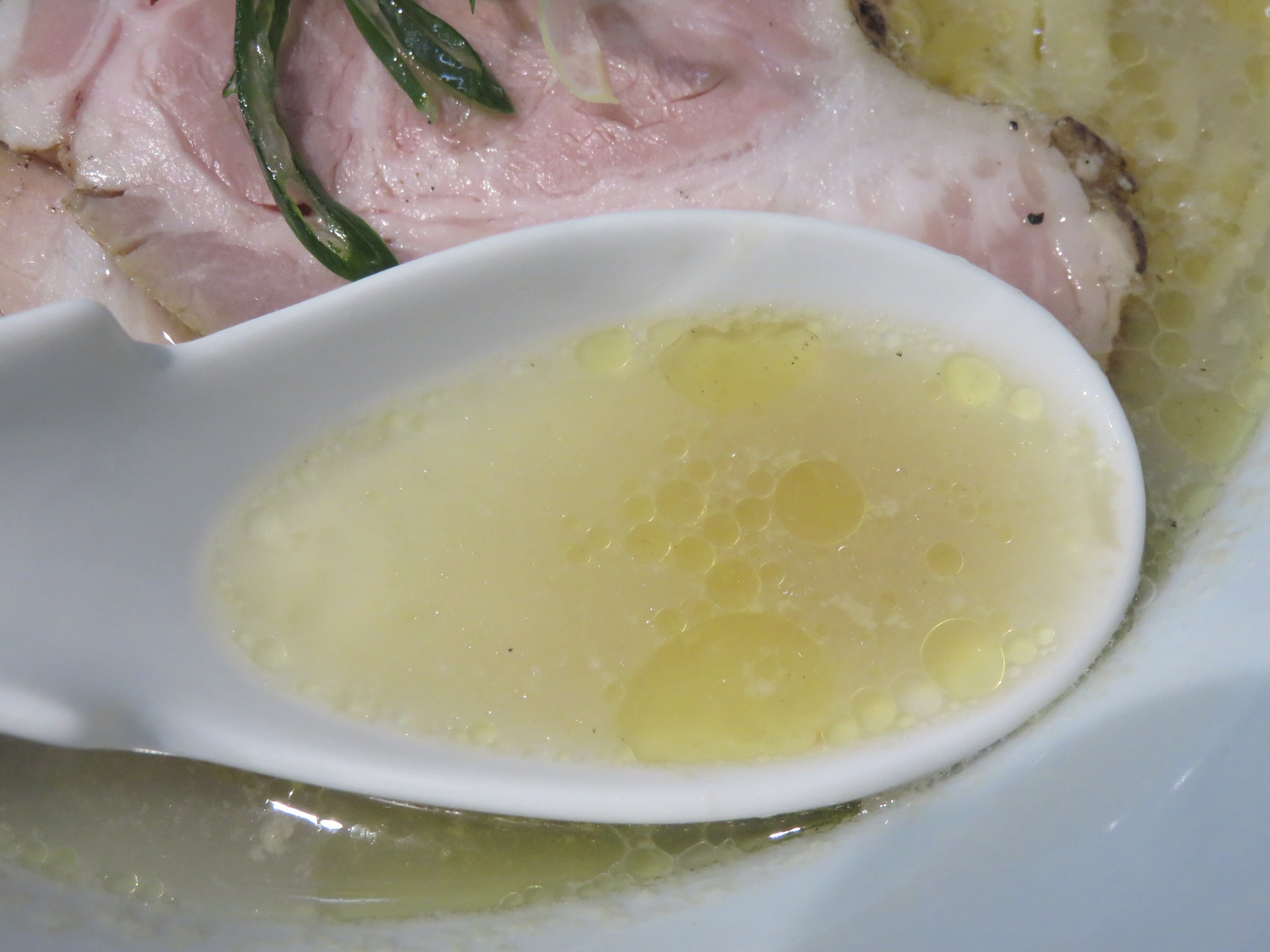 清湯系ですが、貝ペーストが底に溜まっておりわずかに濁っています。