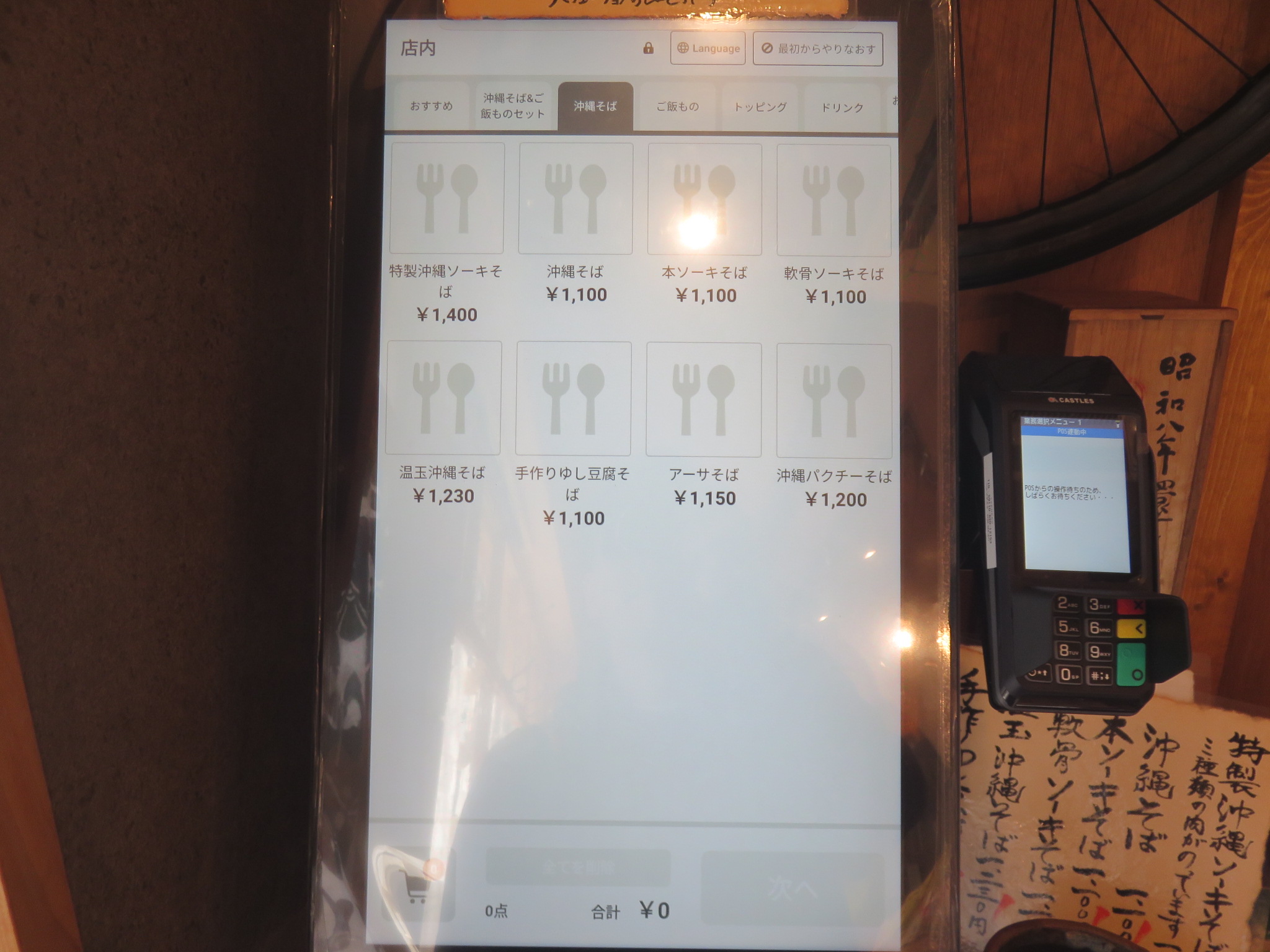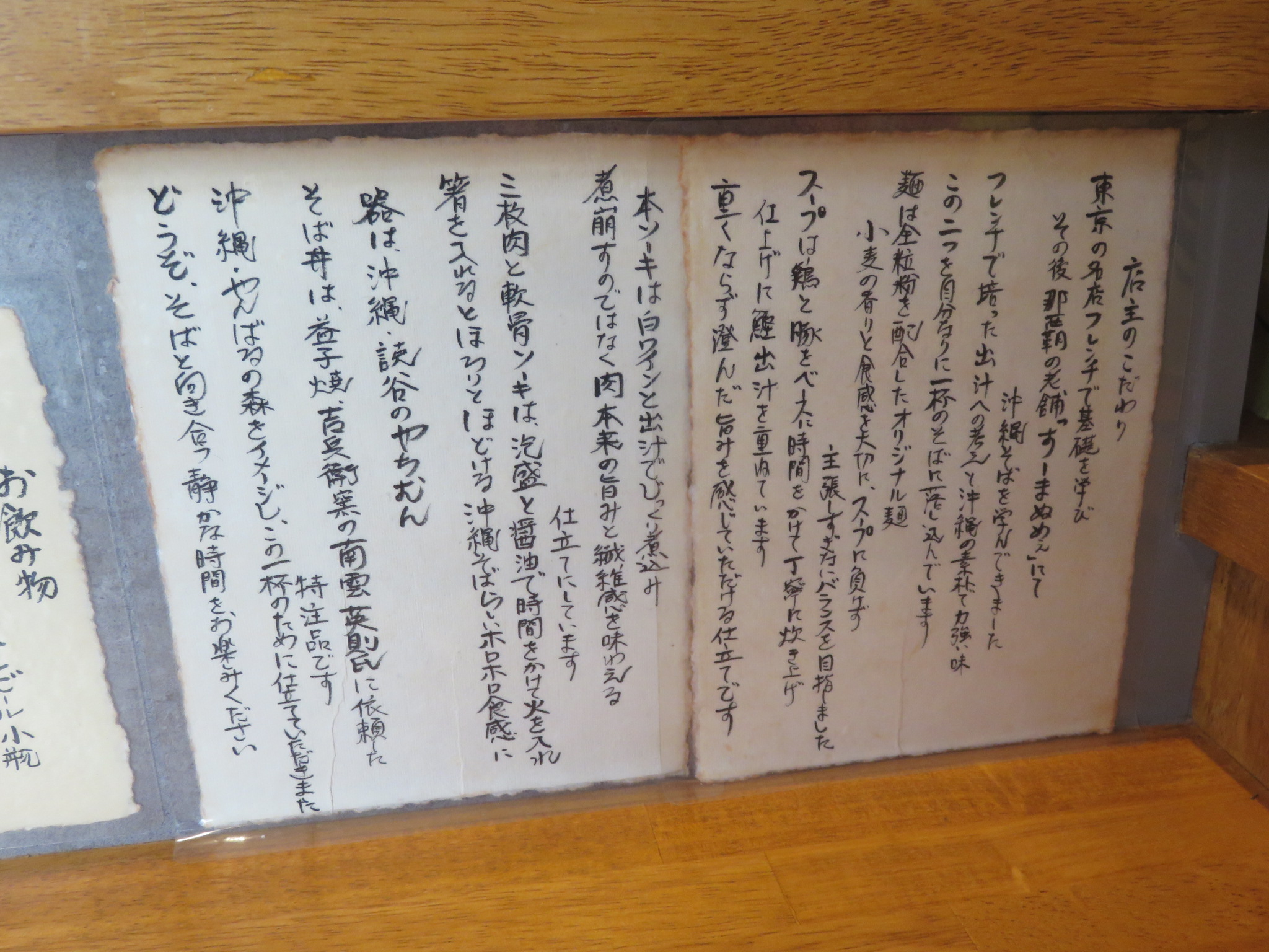 メニューは特製沖縄ソーキそば、沖縄そば、本ソーキそば、軟骨ソーキそば、温玉沖縄そば、手作りゆし豆腐そば、アーサそば、沖縄パクチーそばのラインアップとなっています。