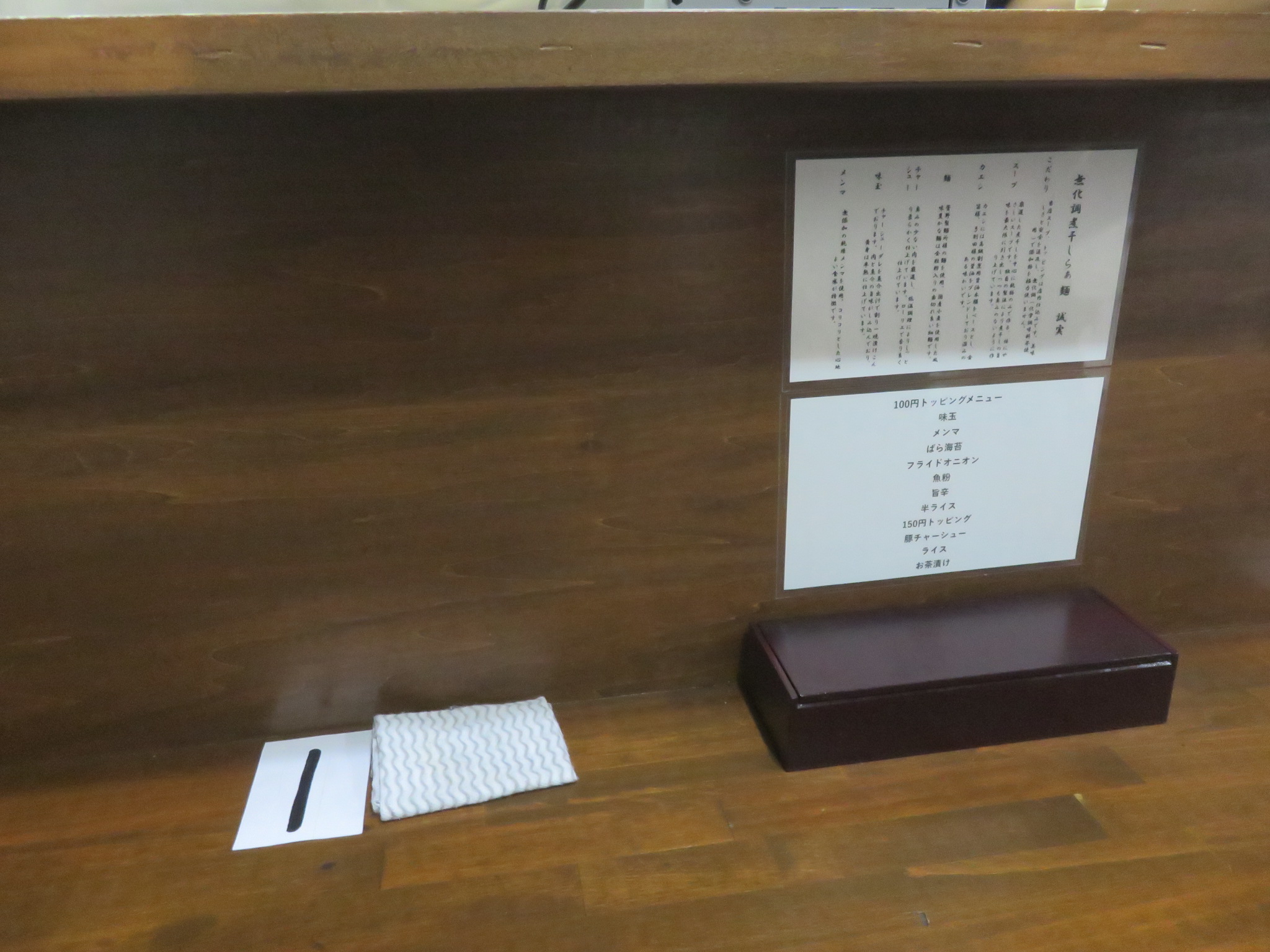 | 具 | 鶏チャーシュー、豚チャーシュー、穂先メンマ、刻み青ネギ |