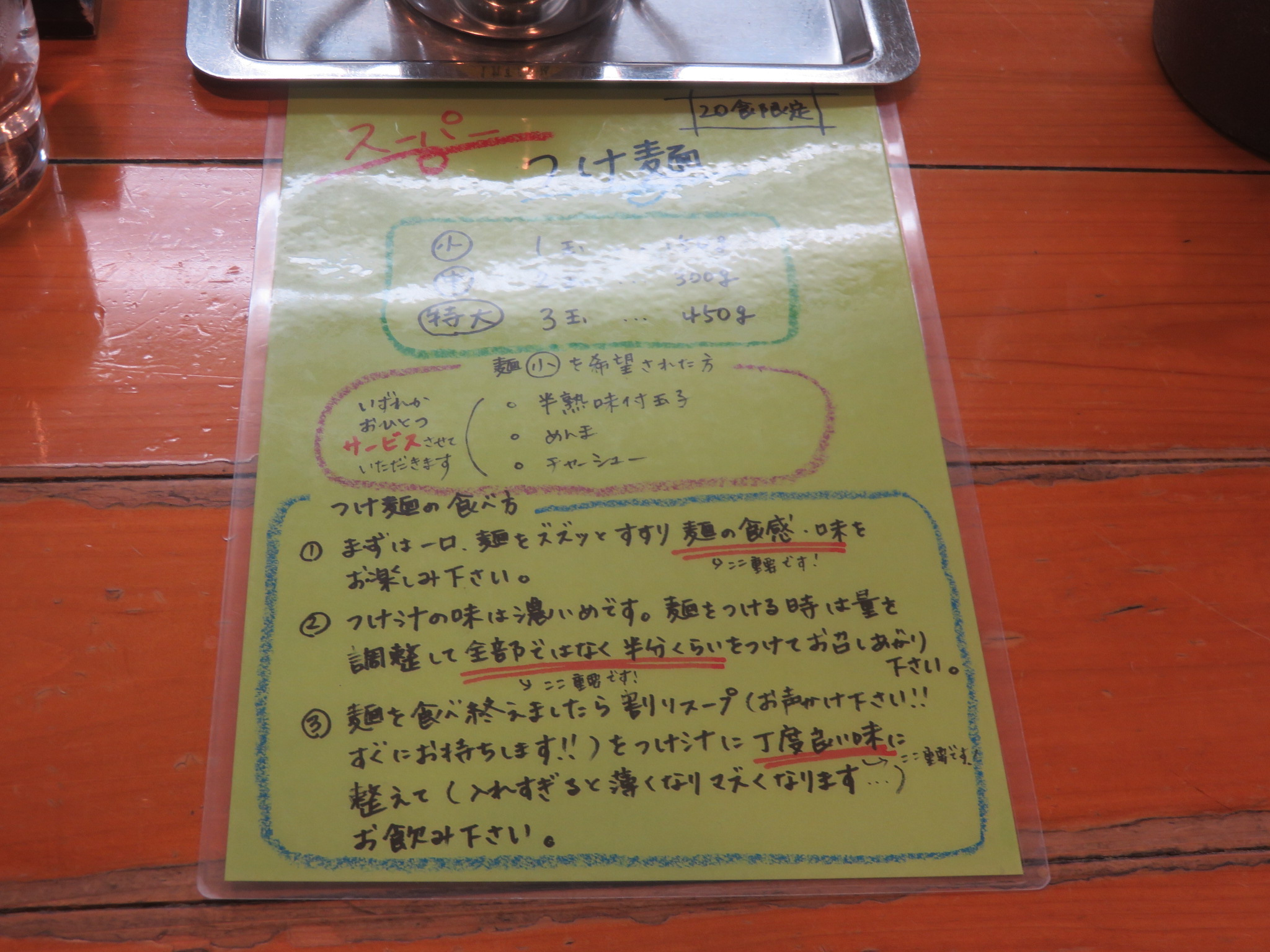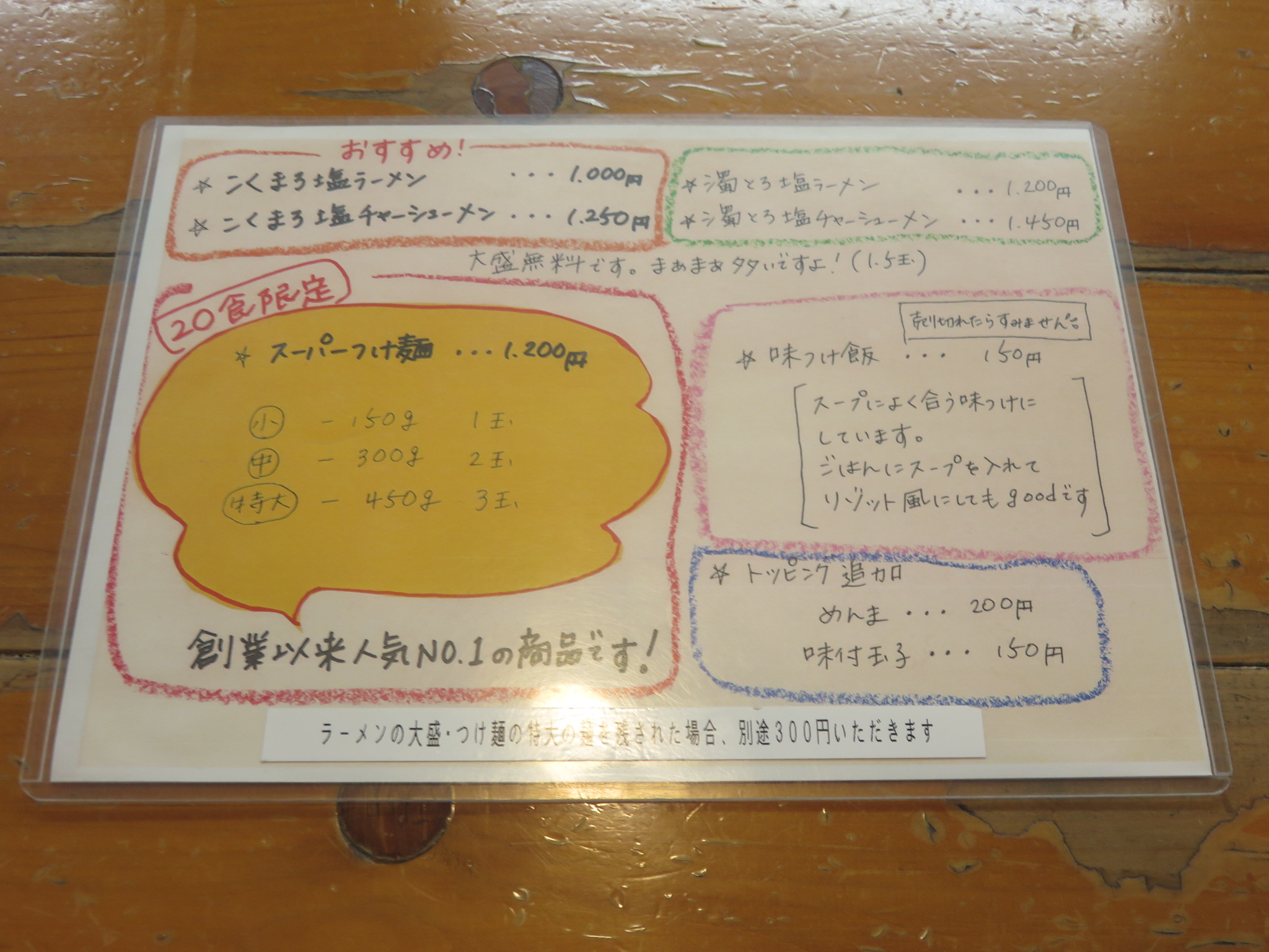 メニューはこくまろ塩ラーメン、濁とろ塩ラーメン、スーパーつけ麺のラインアップとなっており、組み合わせでチャーシューが選べるようです。