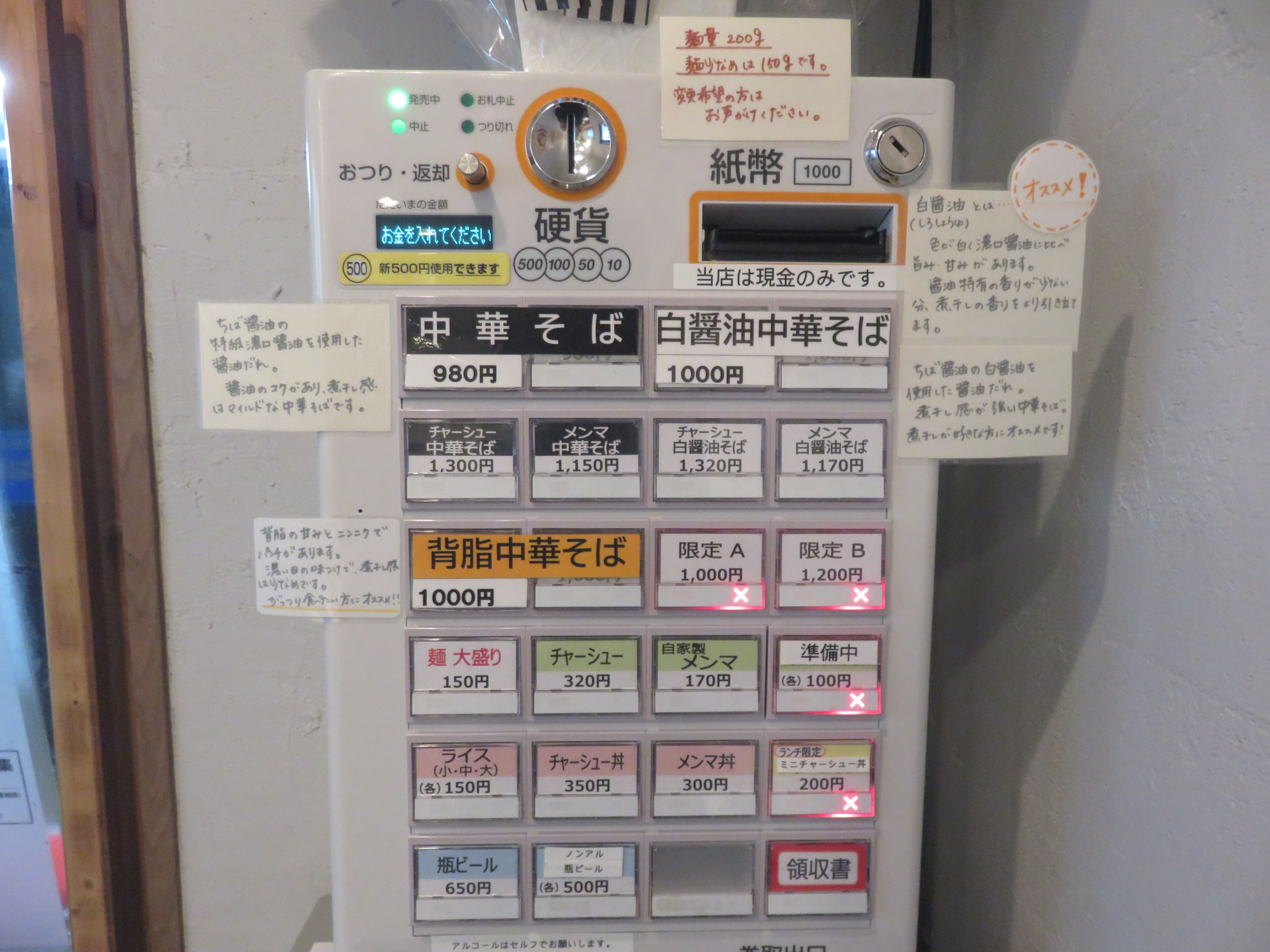 メニューは中華そば、白醤油中華そば、背脂中華そばのラインアップとなっており、組み合わせでチャーシュー、メンマが選べるようです。